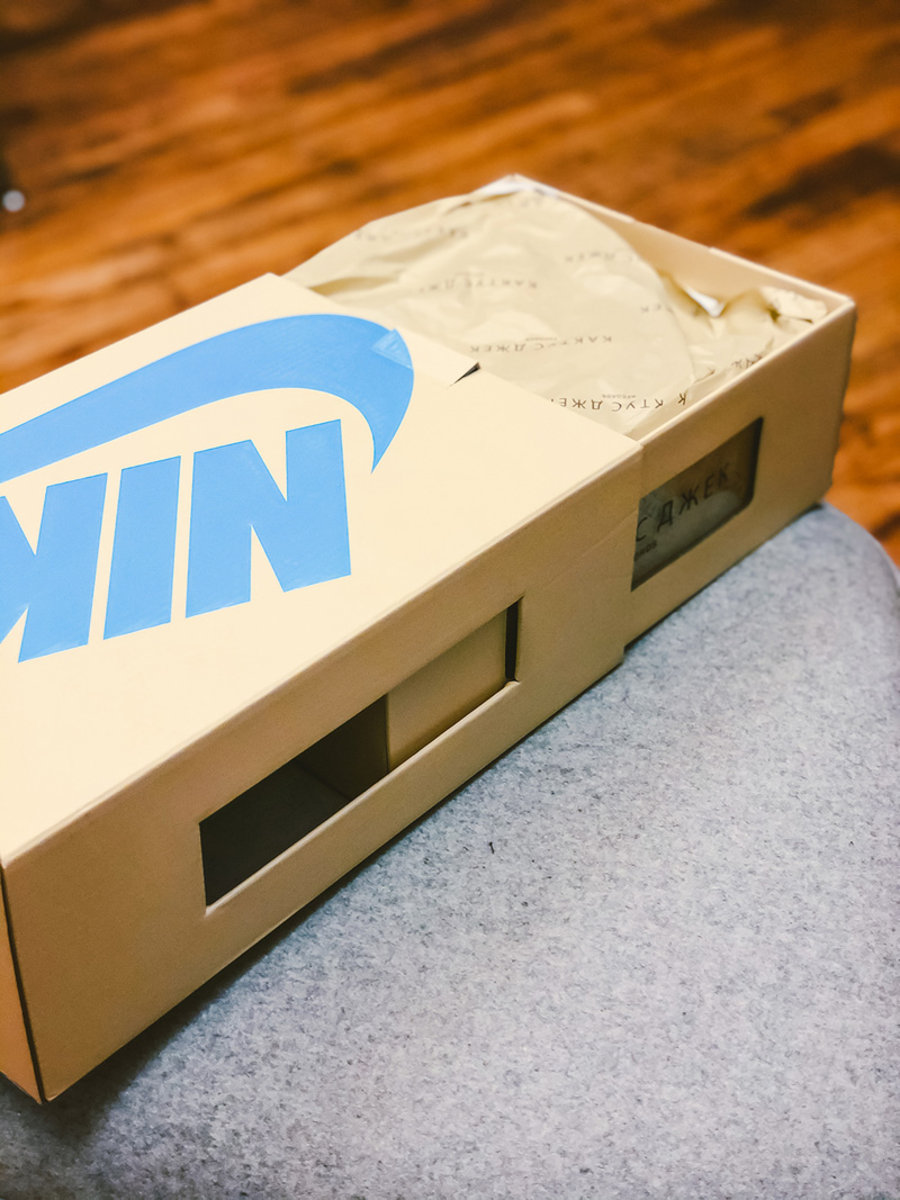 鞋盒采用双层抽屉设计,外层为浅黄色,印有蓝色的 Nike Logo 和 Travis Scott 标志性的鬼脸 Logo。