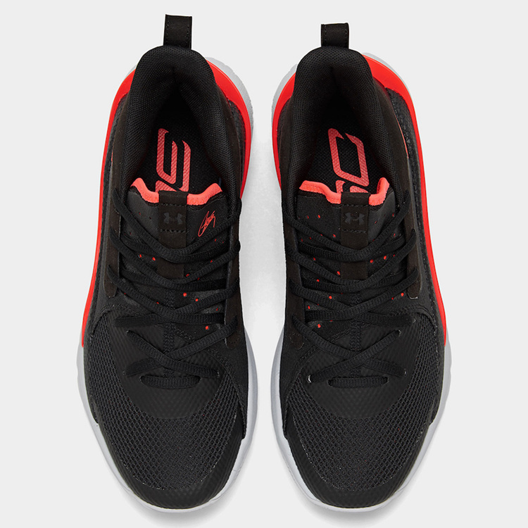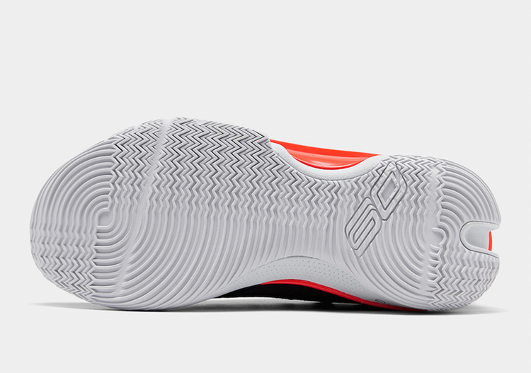 鞋身一袭黑色设计,整体感觉十分沉稳,细节处在鞋舌位置点缀亮眼橙红色库里签名,中底、侧身等位置也用同色妆点。