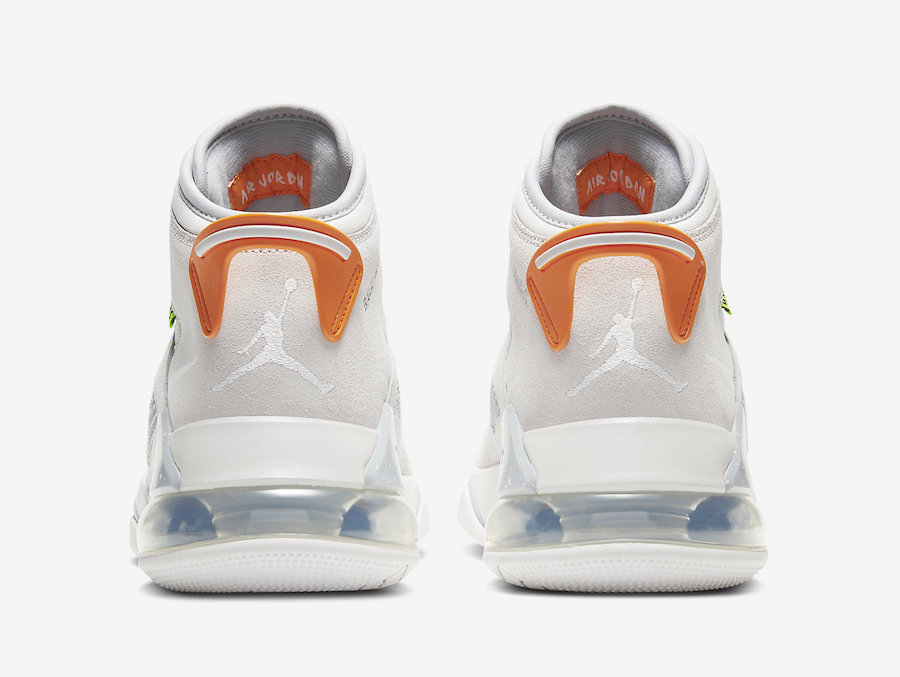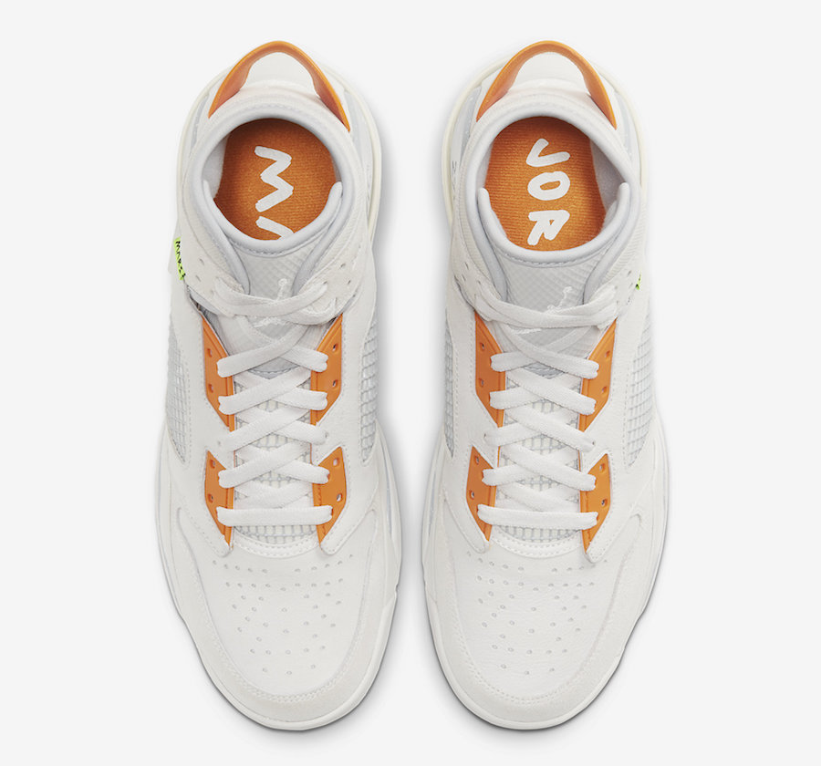 这双鞋以灰白鞋面搭配橙色鞋带扣、后鞋提,鞋帮位置带有荧光绿色 Mars 标签,内侧带有 BALL ALL DAY 标语。