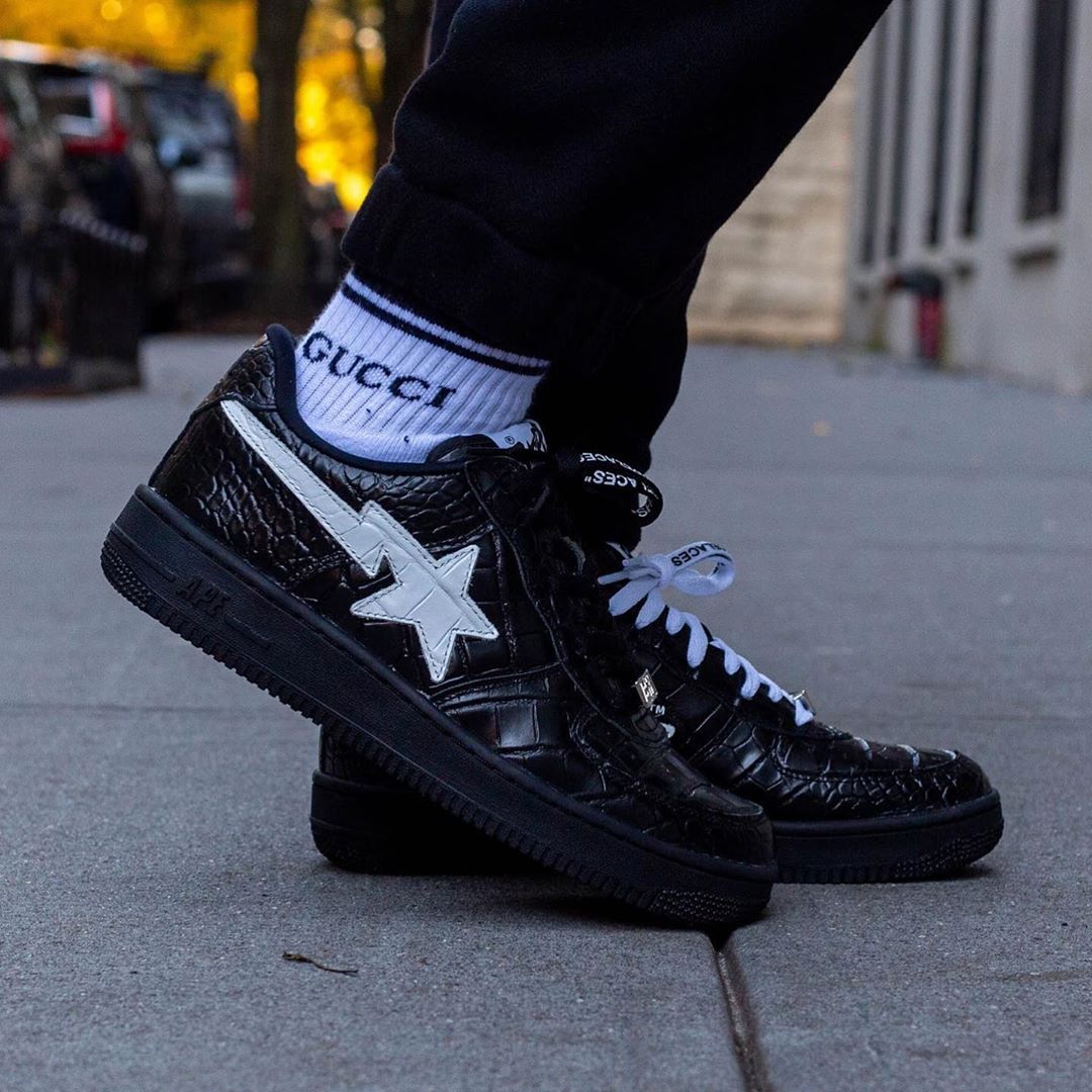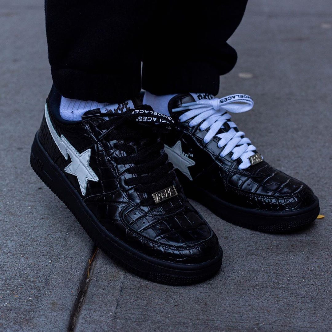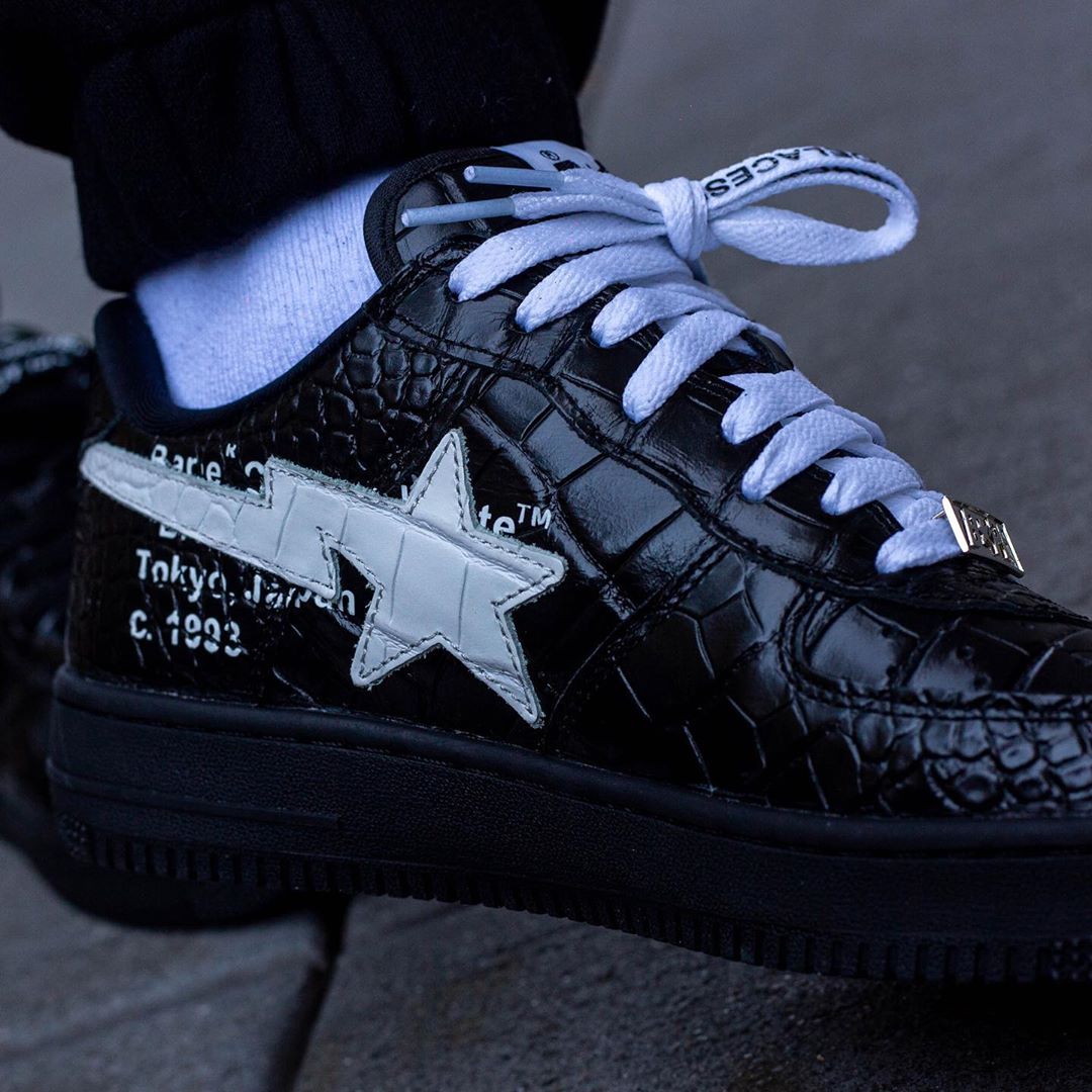 BAPE STA 鞋带扣与侧面闪电星星保留,鞋带及鞋帮内侧加持 OFF-WHITE 招牌涂鸦文字。