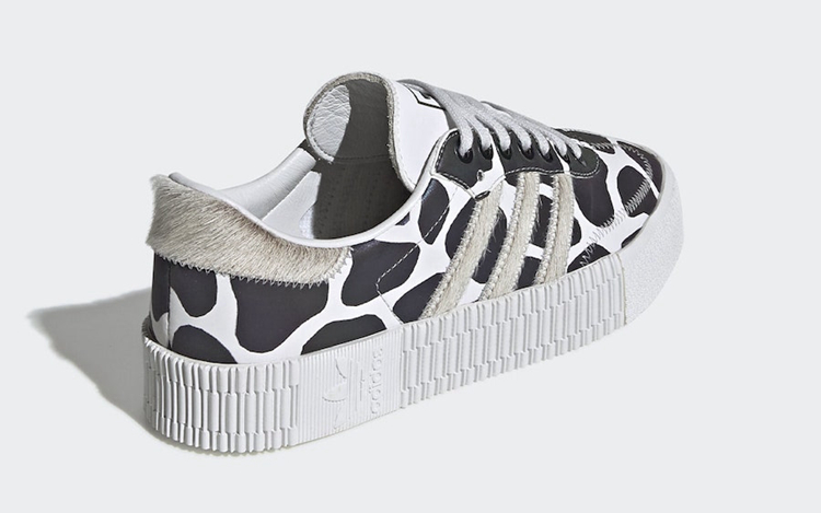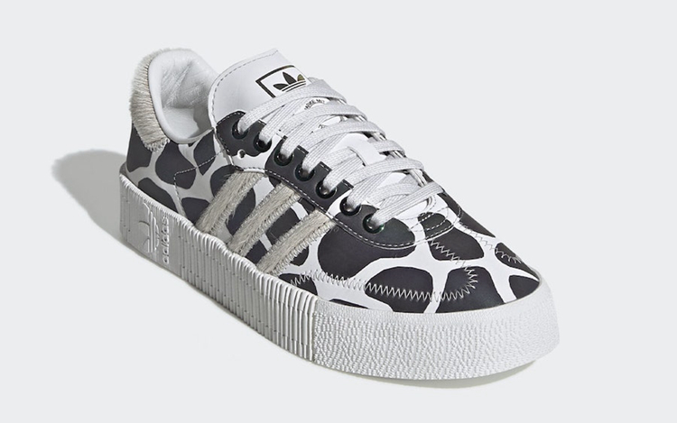 而 Sambarose 鞋型则以长颈鹿纹路注入鞋身,侧身标志性三线 Logo 以及后跟则以人造兽皮材质装饰。