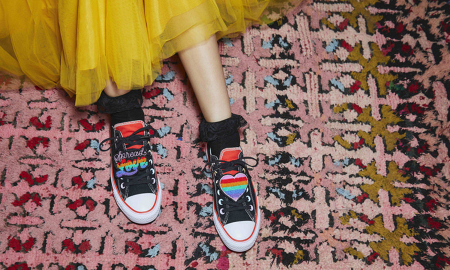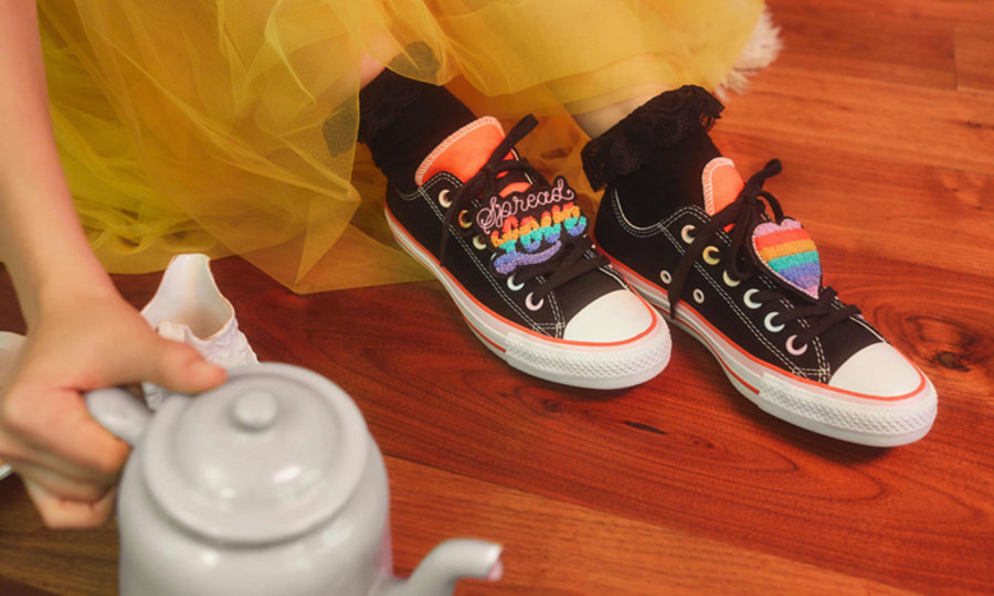低帮款 Chuck Taylor 则以黑色主题呈现,搭配红色鞋舌,鞋身也以红色线条勾勒。同样带有特殊设计的心形与 “Spread Love” 字样鞋带扣。