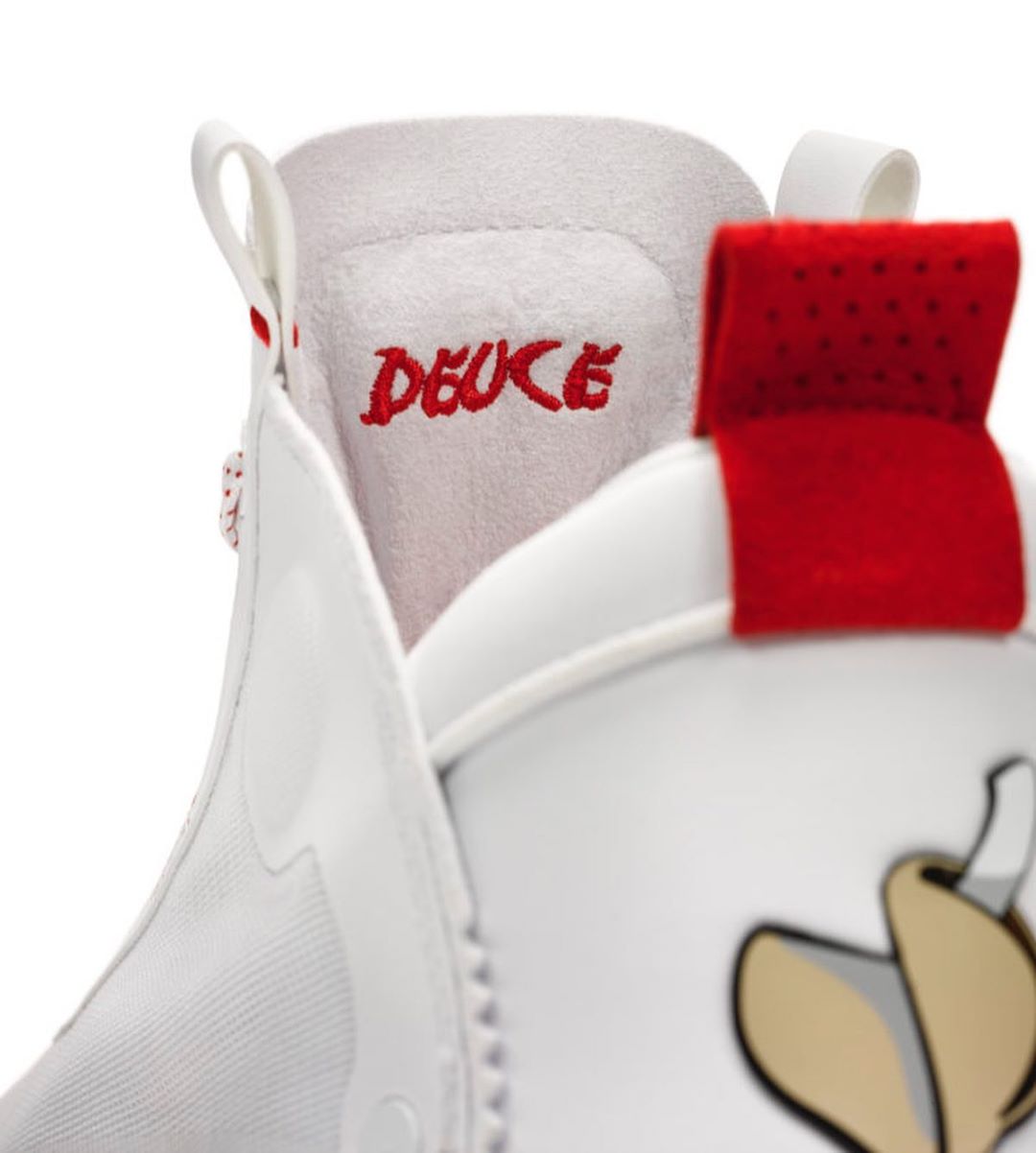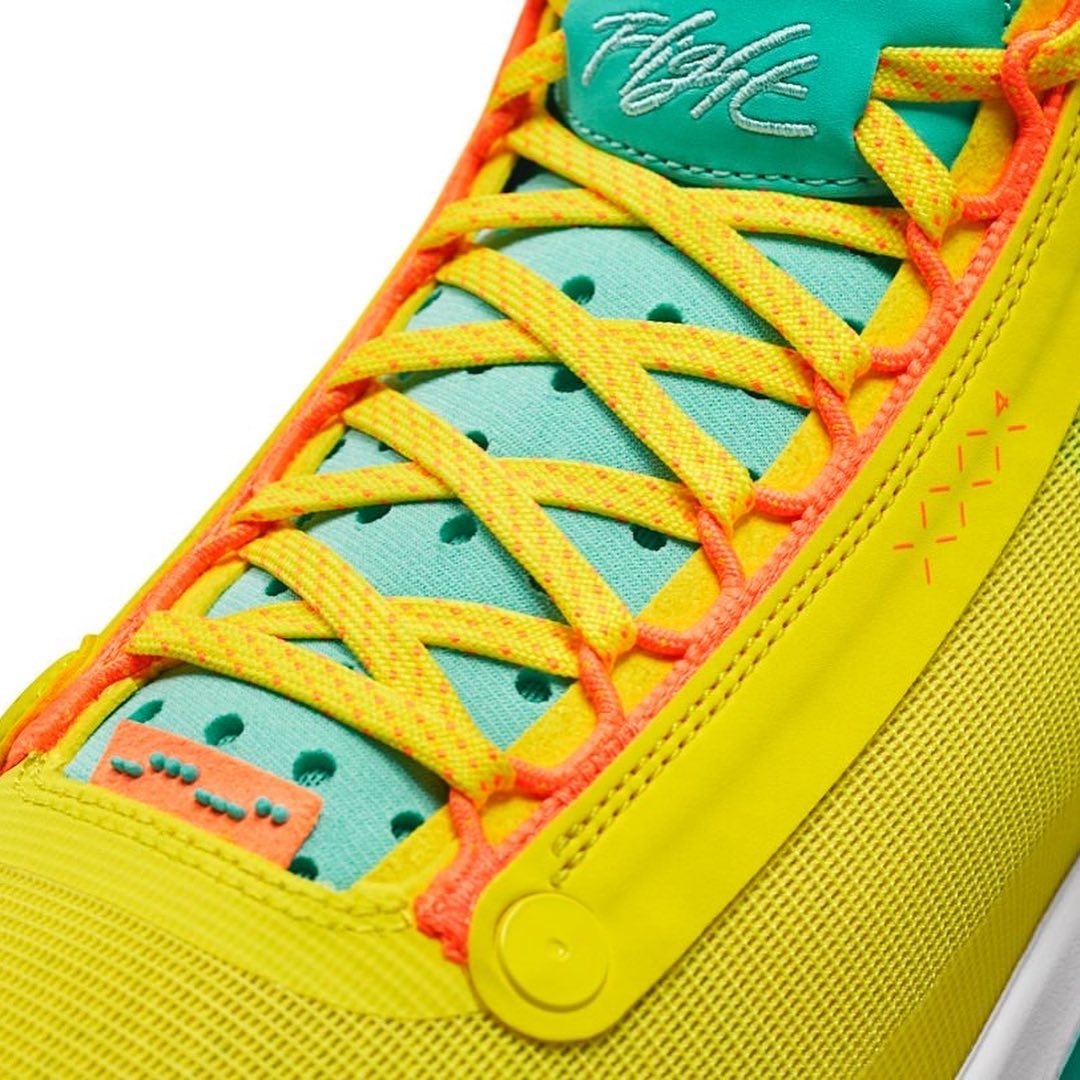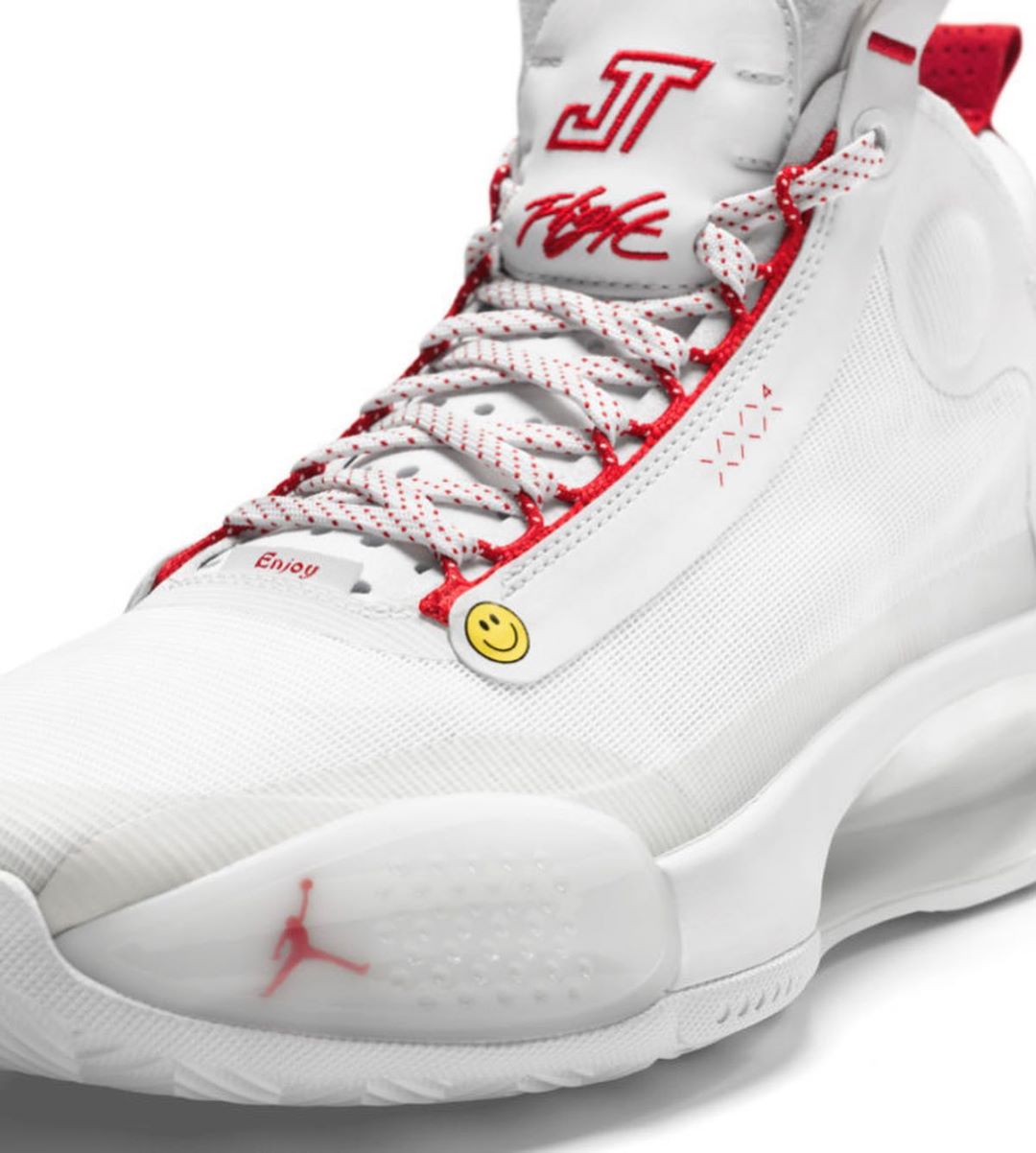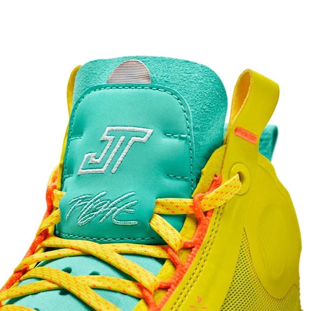 鞋舌处延续一贯的 JT Logo 彰显 PE 身份,同时鞋舌内侧也加入塔图姆儿子 Deuce 的刺绣设计。
