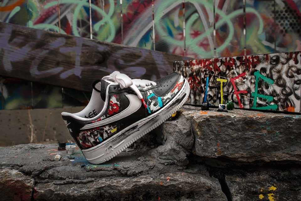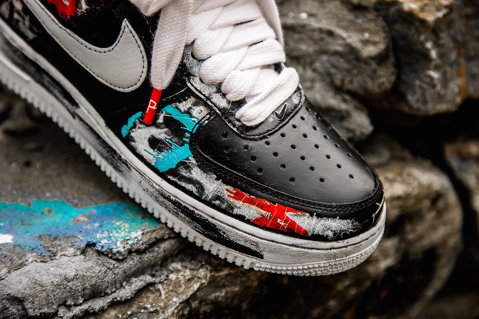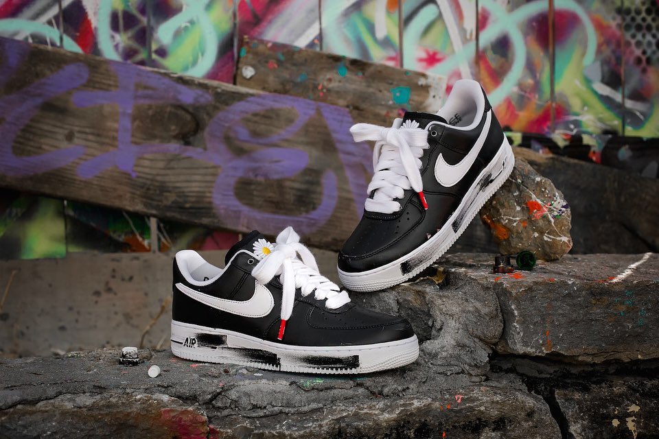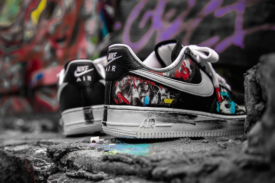 以经典的 Air Force 1 Low 造型为蓝本,整体辅以黑、白双色打造,白色中底和外底都点缀有黑色涂鸦油漆,呈现出独特的做旧效果。