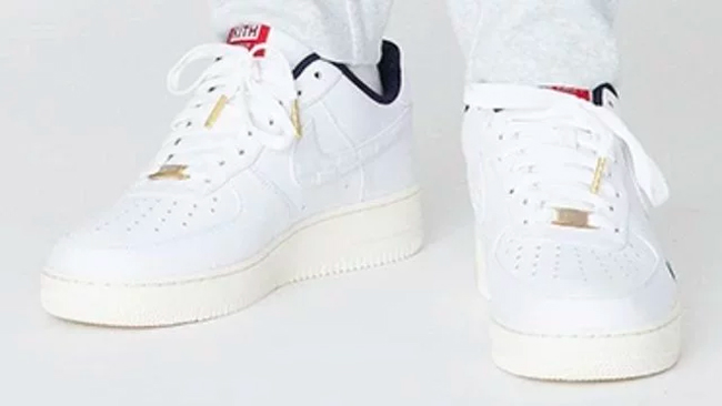 鞋面以质感出众的白色皮革打造,鞋身 Swoosh 压印有 KITH Logo,鞋舌处的红色缝标同样能彰显联名身份,鞋带扣与鞋带头都使用金色金属点缀。