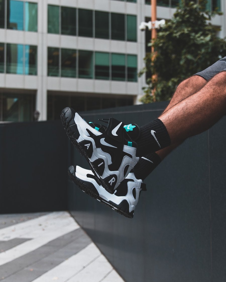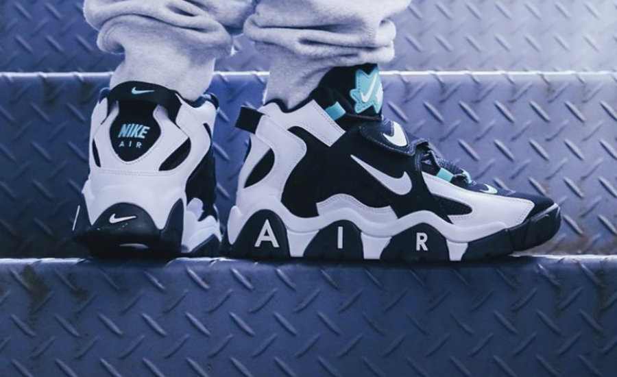 宽大复古造型、黑白、AIR 字样,是权志龙挚爱大 AIR 的几个特点。而这几个特点在刚刚复刻的 Air Barrage Mid 上得以完美再现。