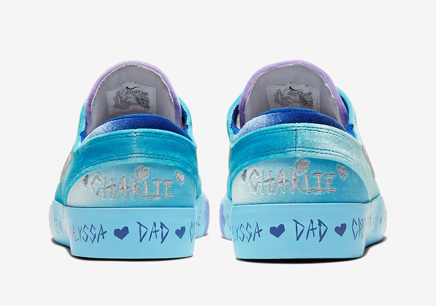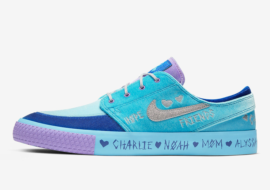 银色 Swoosh Logo,内外侧分别带有 HOPE、FRIENDS、FAMILY、LOVE、桃心等手绘风格刺绣纹饰,后跟则是他的治疗猫 Charlie,个性醒目且又独具风格,是此前不多见的样式。