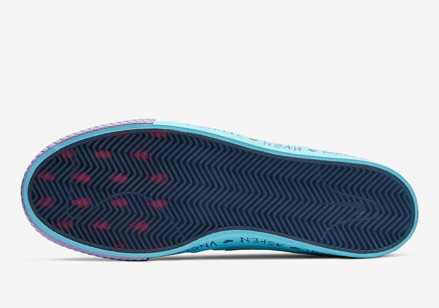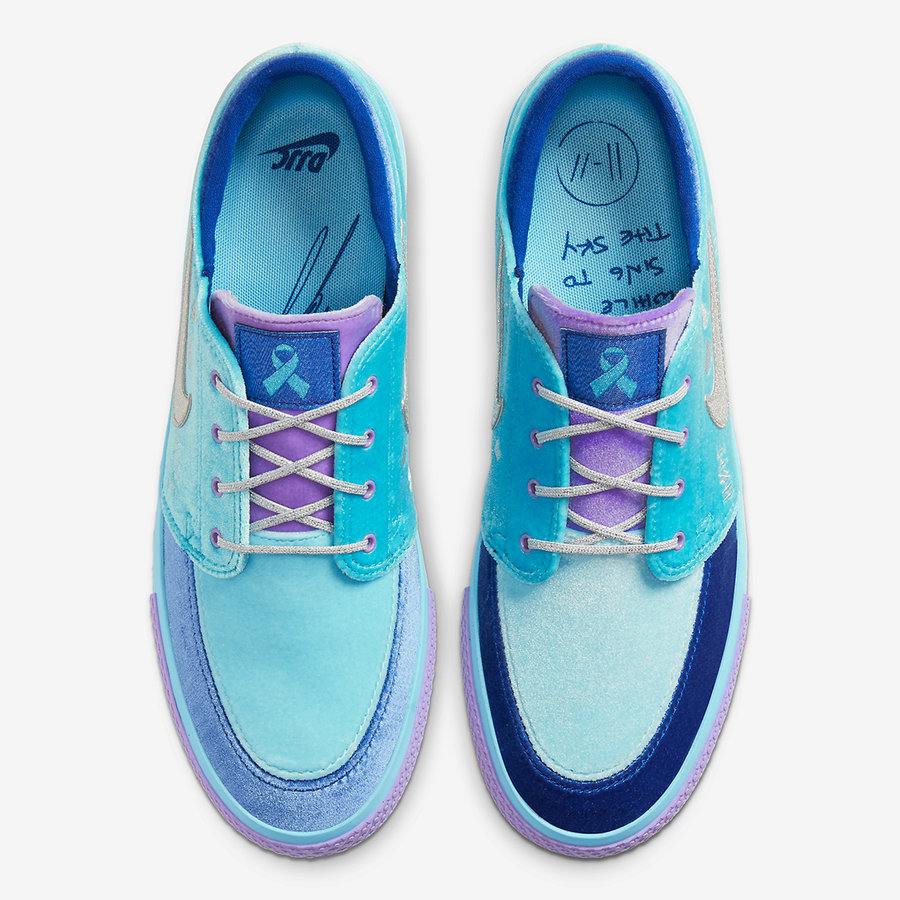 这双鞋采用亮眼的 Tiffany 湖水蓝为主色调,搭配紫罗兰、海军蓝等低饱和度的装饰色,组成清爽的鞋身配色。