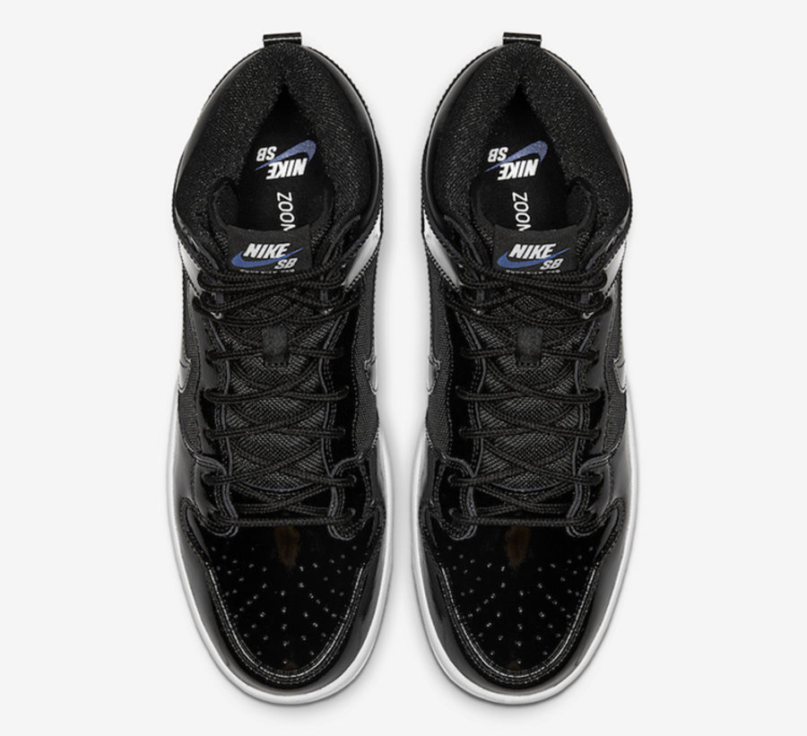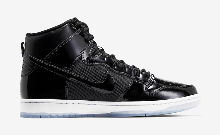 整双鞋以 Nike SB Dunk High 造型呈现,鞋身一袭亮眼漆皮下,酷黑造型一览无余。侧身网眼材质也进一步提升整体层次感。