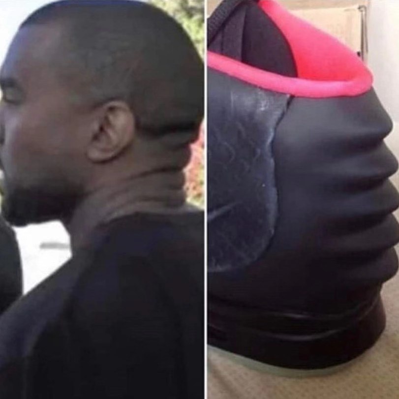 从 Nike Air Yeezy 2 开始就有网友恶搞,表示鞋子后跟的设计灵感可能是来自侃爷的脖颈。