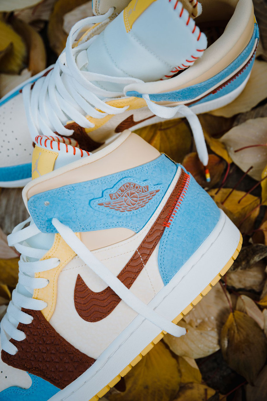 将非洲风格的设计与手工缝制细节运用到这双 Air Jordan 1 mid 中,以纪念品牌创始人的非洲血脉。