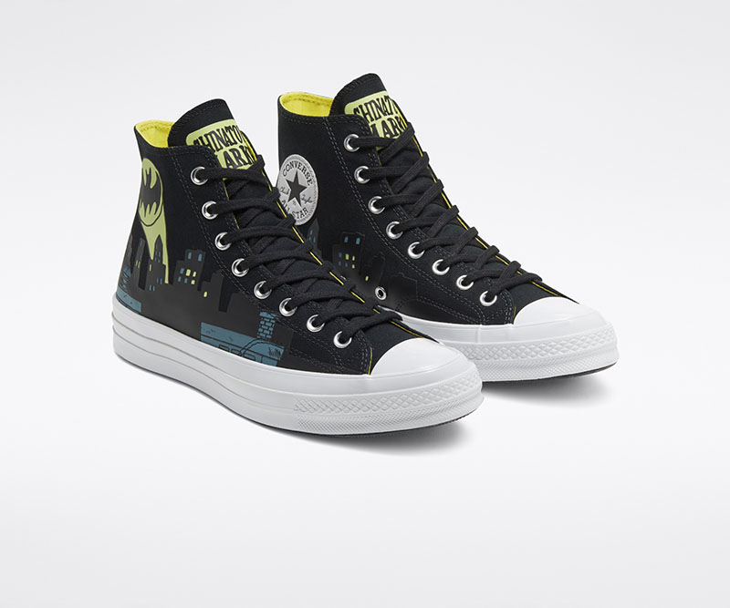 另一双以哥谭市的魅夜剪影为主题,帆布上的荧光绿材质实则为夜光材质,黑灯下犹如还原了漫画中哥谭的景色,非常有新意!