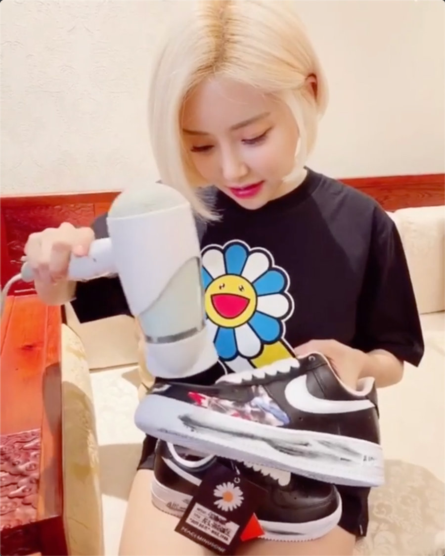 身穿 OVO x 村上隆的 Soda,首先将手中的权志龙 Air Force 1 的刮刮乐部分,通过吹风机进行加热。