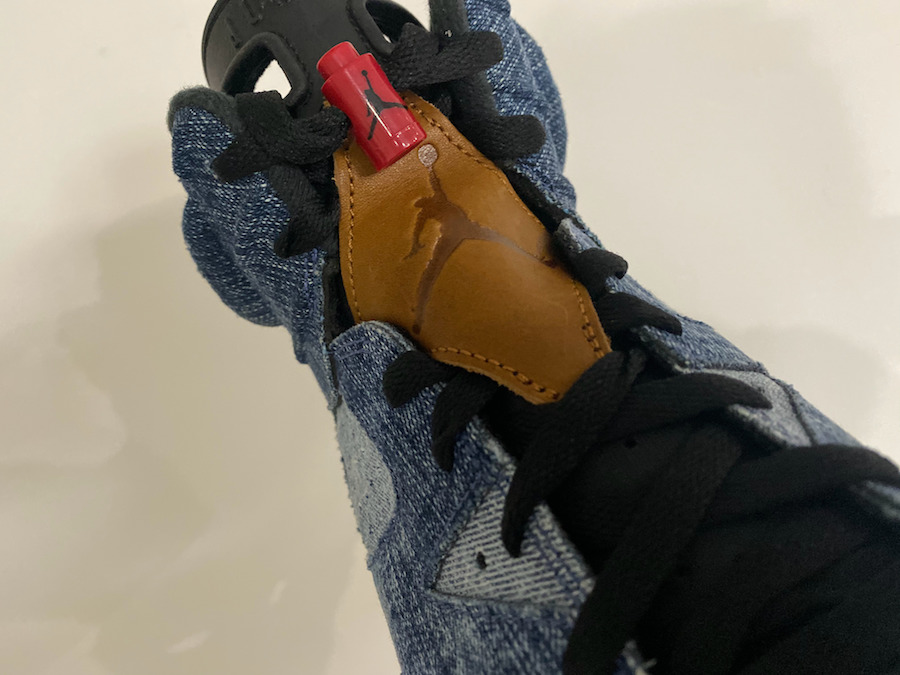 整体的一处亮点在于鞋舌部位以牛仔裤的上棕色皮章材质打造,其上压印有标志性的 Jumpman Logo,搭配红色鞋带扣,吸睛效果十足。