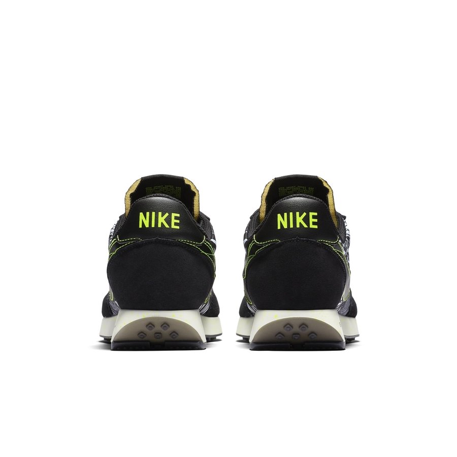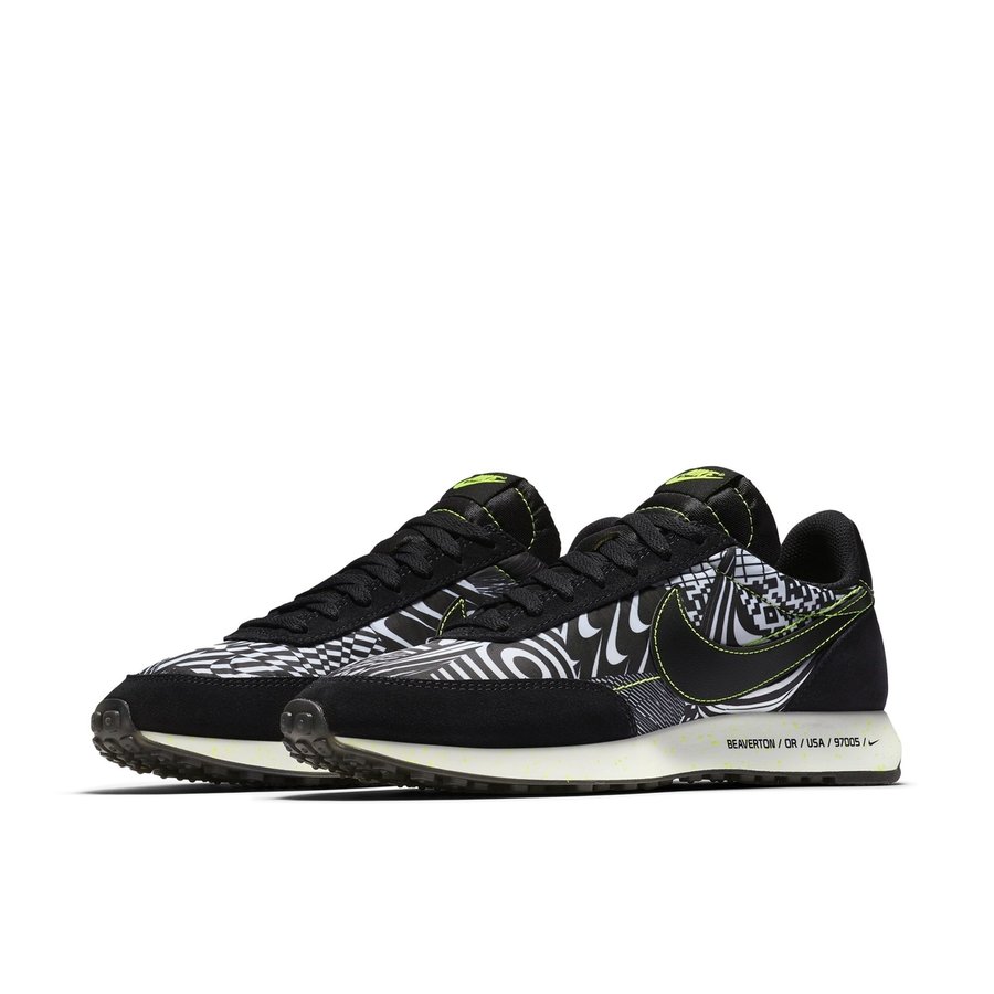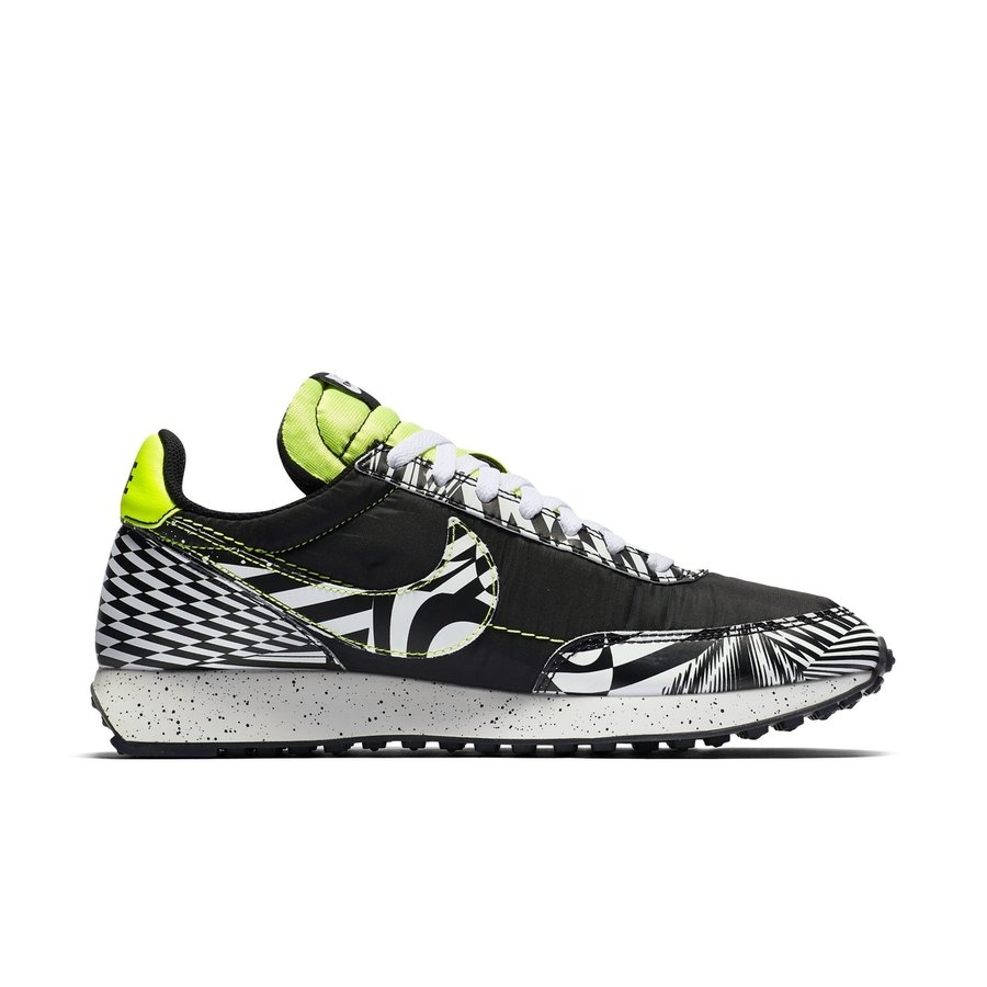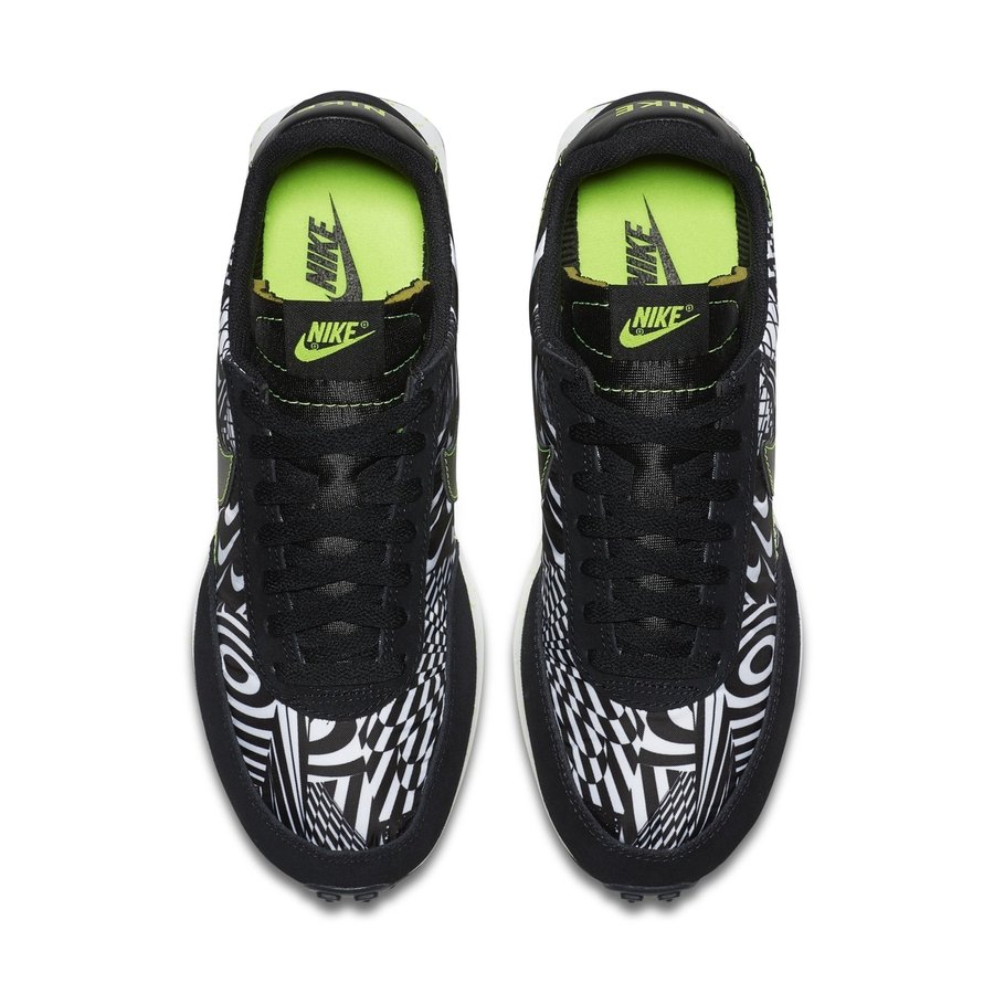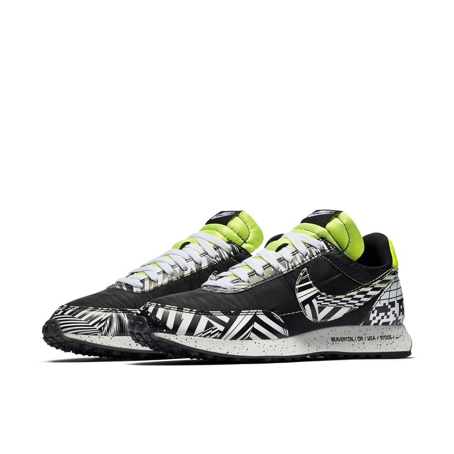 黑白两色为主体,以条纹、网格和 Swoosh 等图案组成的眩晕迷彩装扮,并以荧光绿点缀,带来前所未有的炫酷造型。
