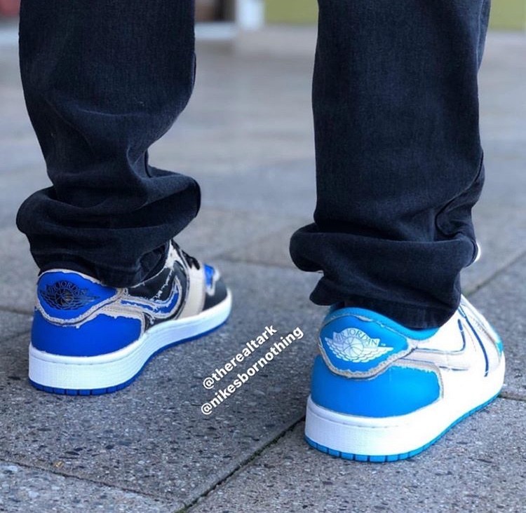 低帮造型轻便百搭,一袭米黄鞋身内衬分别以蓝黑、北卡点缀。最大亮点当属可撕鞋面的双层设计,后跟还暗藏 AJ1 飞翼 Logo。