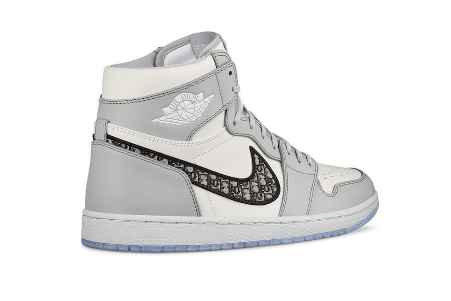 鞋面以乳白色和浅灰色为主调,侧面 Swoosh 以 Dior 经典的满印老花帆布打造,鞋帮上的经典飞翼改为 “AIR DIOR” 字样彰显联名身份。