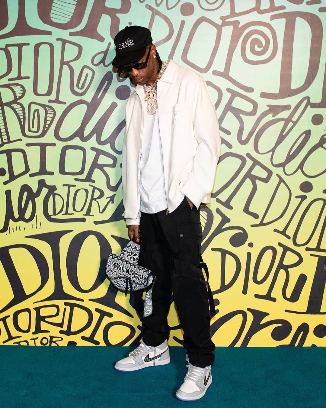 Travis Scott 出席 Dior Men Fall 2020,率先上脚了 Dior x Air Jordan 1,以黑白搭配呈现出与以往不同的时尚高级感。