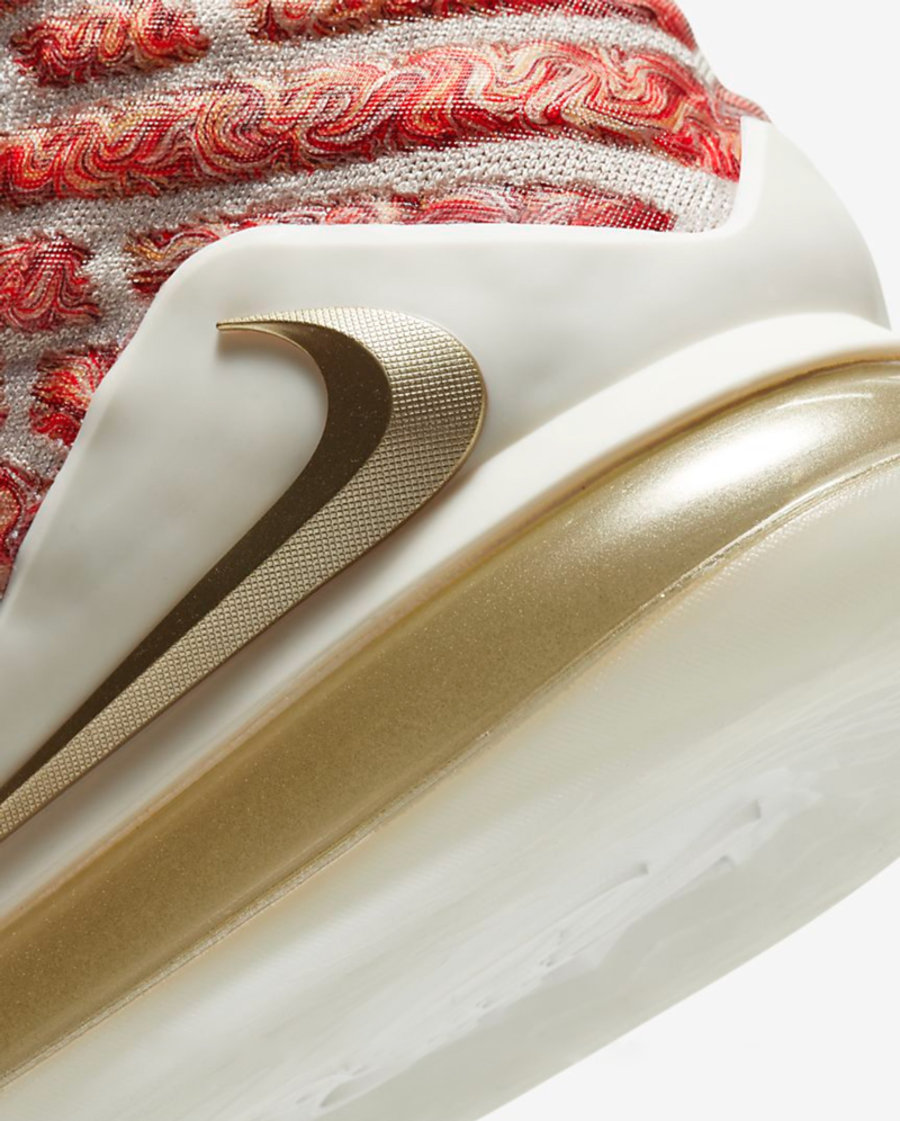 中底处辅以霸气的金色反钩与全金涂装的气垫妆点,呼应了代表冠军奖杯的配色。