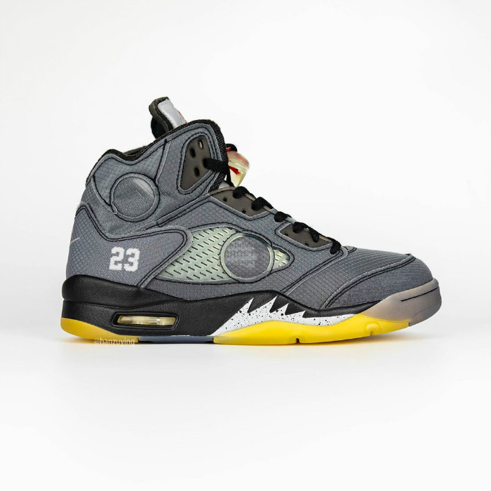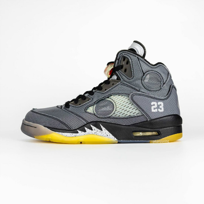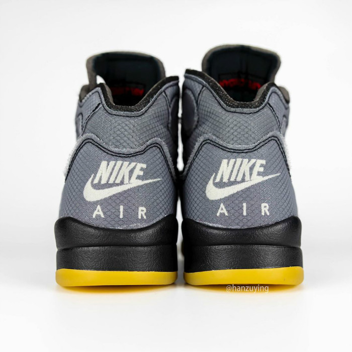 以 Air Jordan 5 为蓝本,烟熏黑鞋身采用蝉翼材质覆盖,搭配同色系中底与银色火焰,后跟点缀 23 刺绣和 Nike Air 元年 Logo!