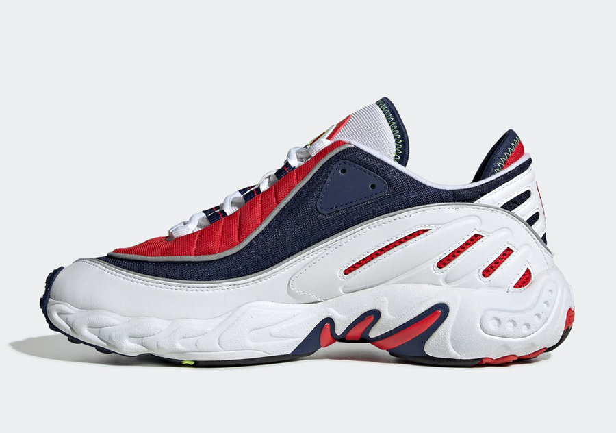 首发配色以红、蓝、白三色装饰,鞋身以尼龙和皮革材质打造。通过匝线分割出丰富的鞋身层次,细节设计非常有质感。