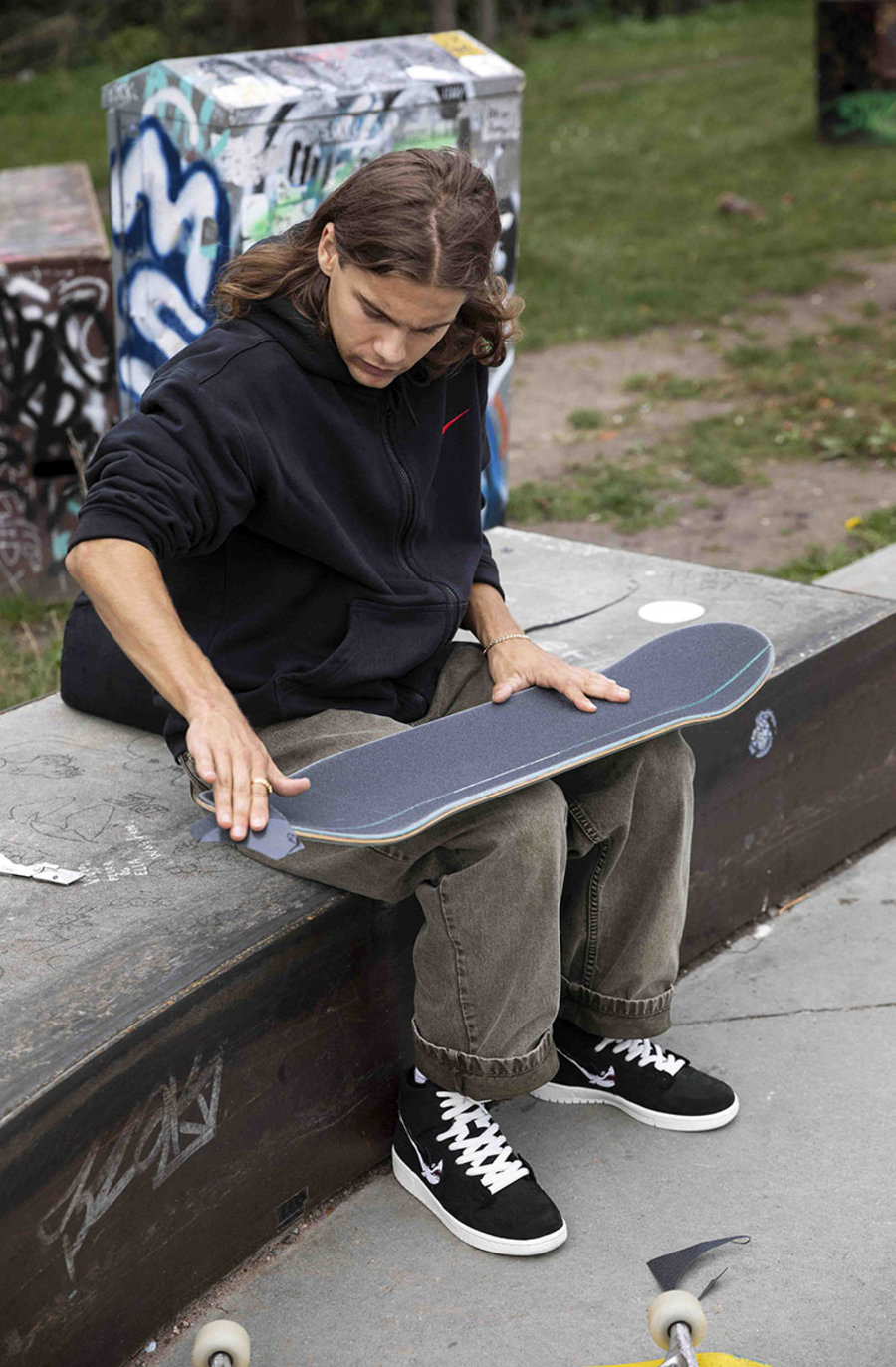 Nike SB 与 Oskar Rozenberg-Hallberg (绰号 Oski)联手打造首个 Orange Label 系列,涵盖鲨鱼 Dunk Hi 与灯芯绒 Blazer 及相关配套服饰。