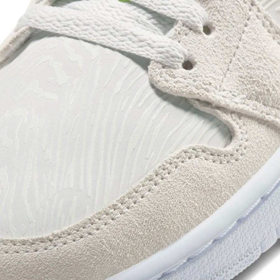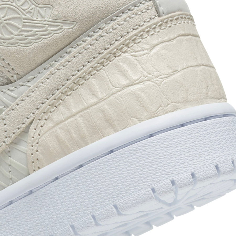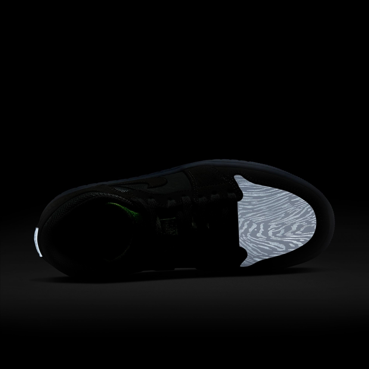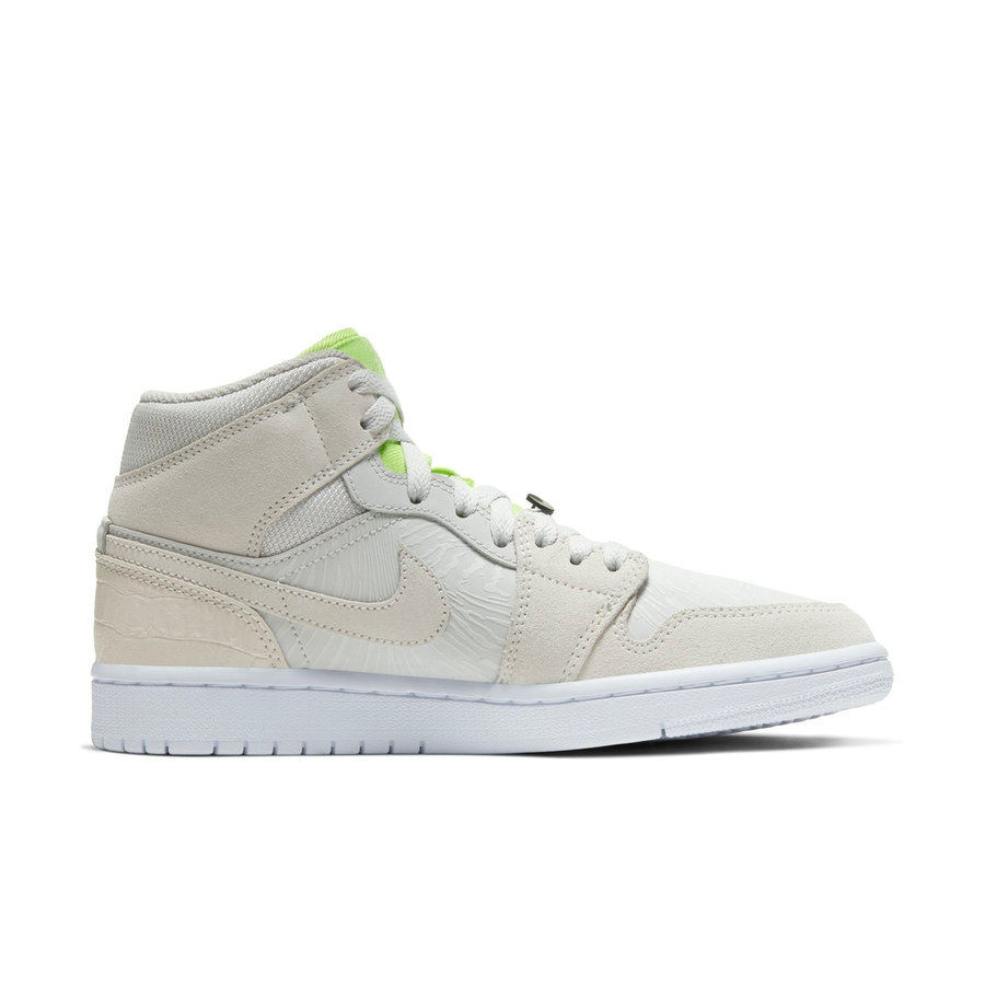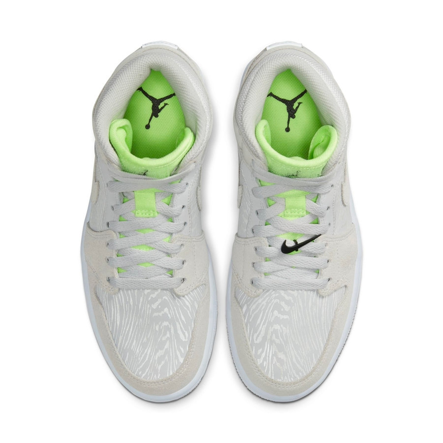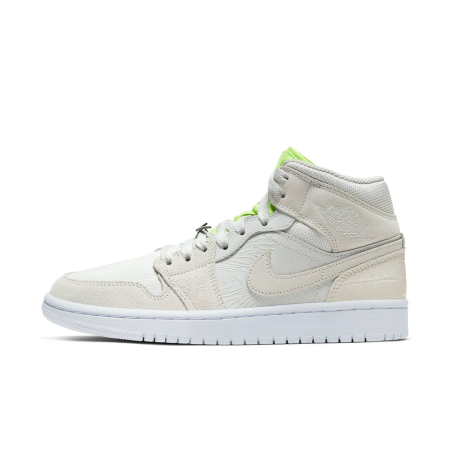 延续 Air Jordan 1 Mid 的造型,灰色麂皮搭配 3M 材质装扮鞋身,夜晚看更亮眼。