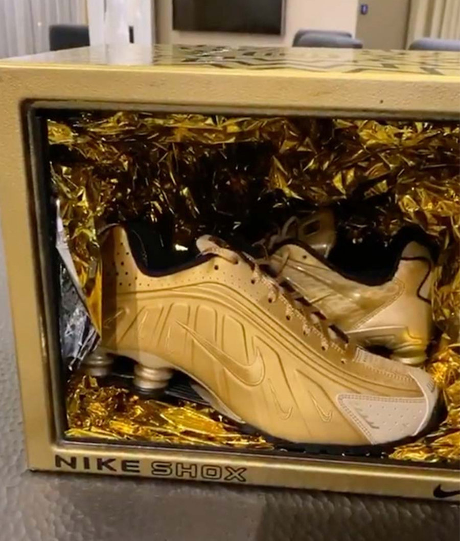 两款鞋分别采用 Nike 经典 Shox R4 与 Shox TL 鞋型为设计蓝本。鞋身构色均以金色主题呈现,搭配金色鞋带与侧身金色 Swoosh Logo,整双鞋呈现出极为奢华的视觉效果。