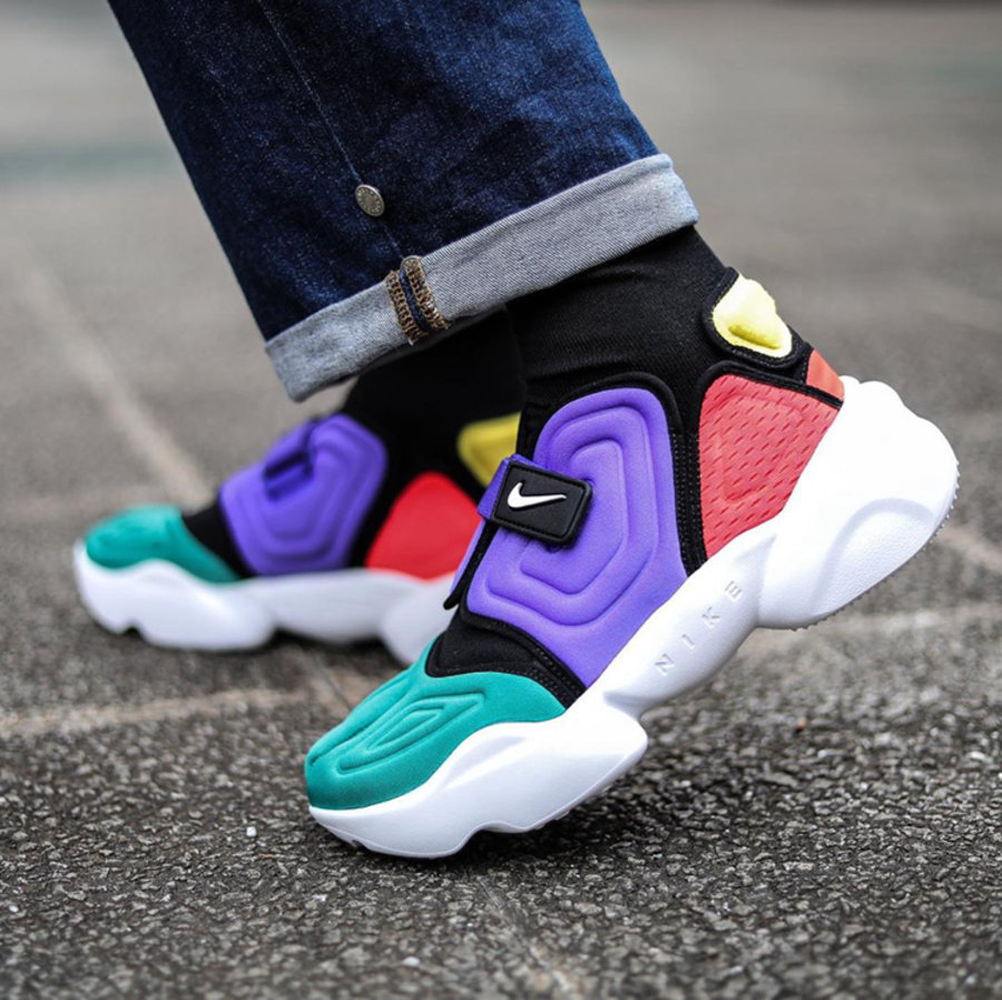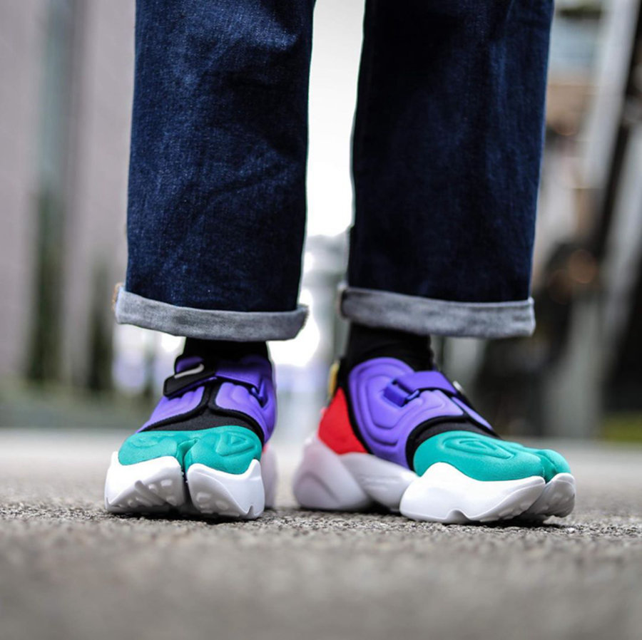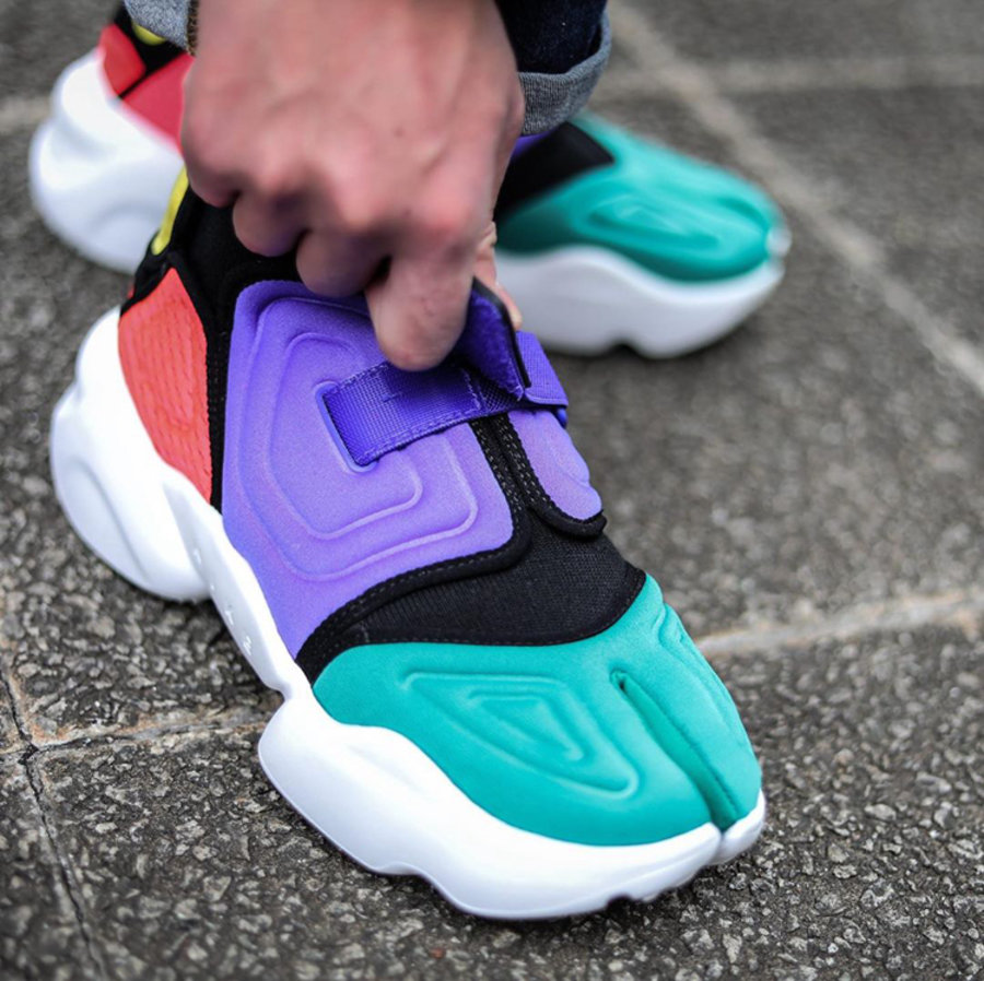 另外一款则融合了元年版 Air Rift 样品及原型的两款配色,绿色、紫色以及红色分别覆盖在鞋头、鞋身以及后跟位置,加之圆润的鞋头设计,颇有几分彩蛋的韵味。