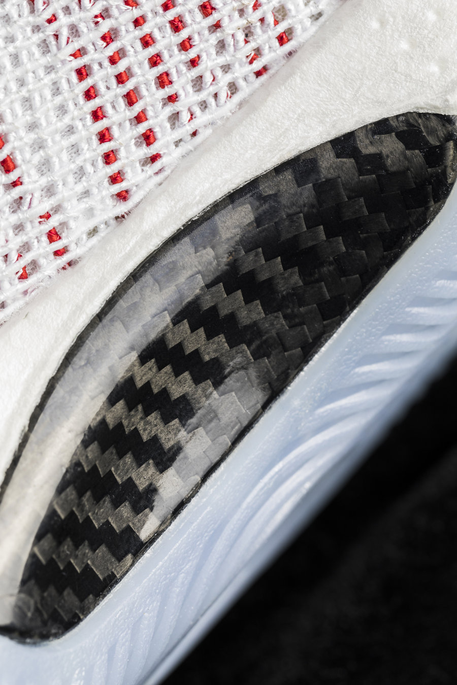 䨻版本另一大卖点就是大面积的碳板配置。采用立体造型设计带来更高强度,覆盖整个中足并向前后掌延伸。
