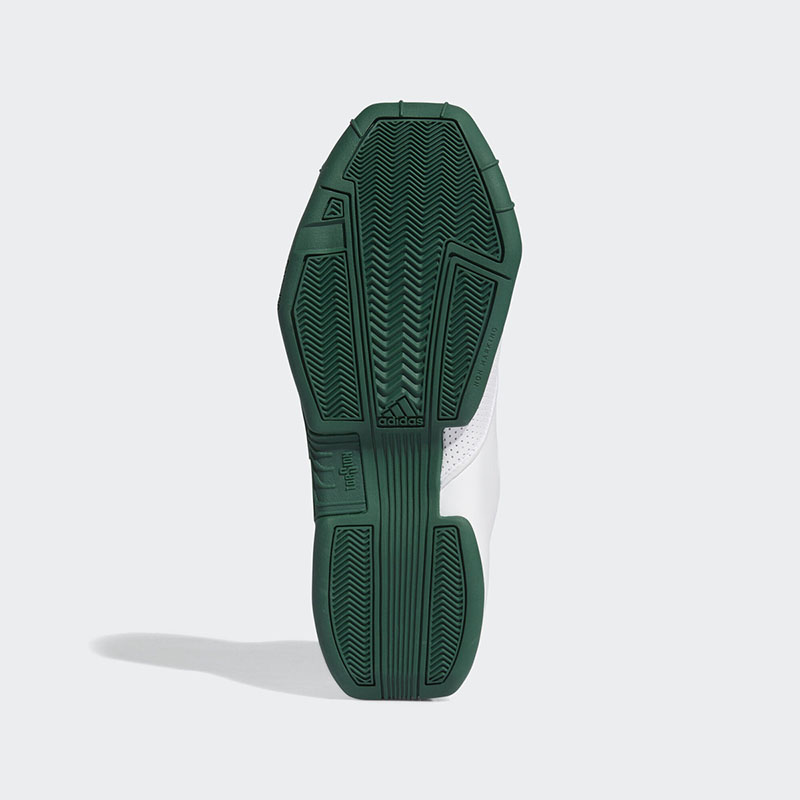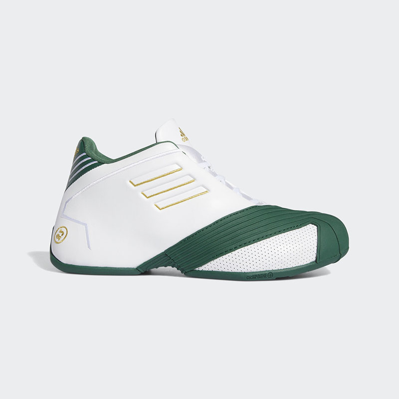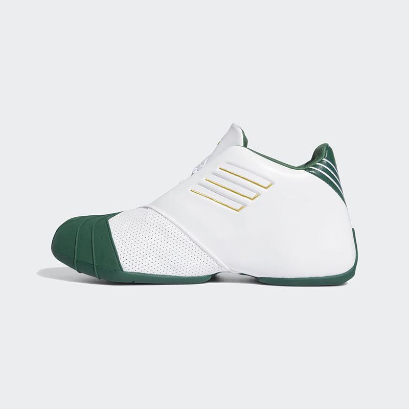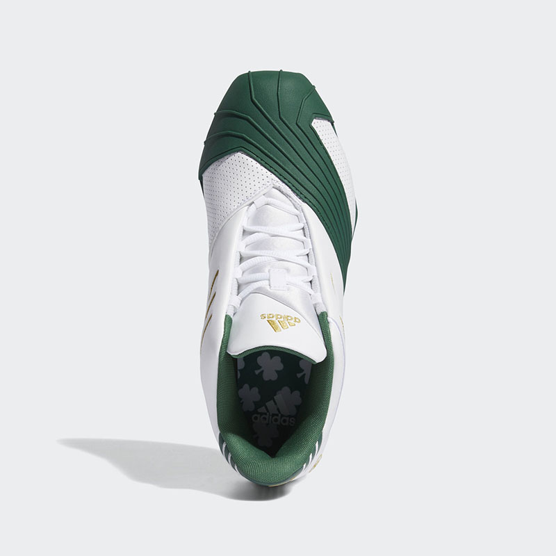 鞋身以白色为底,学校标志性的绿、金贯穿期间,后跟位置则有詹姆斯 23 球衣号码替代原有的麦迪 1 号数字,彰显 PE 的独特身份!