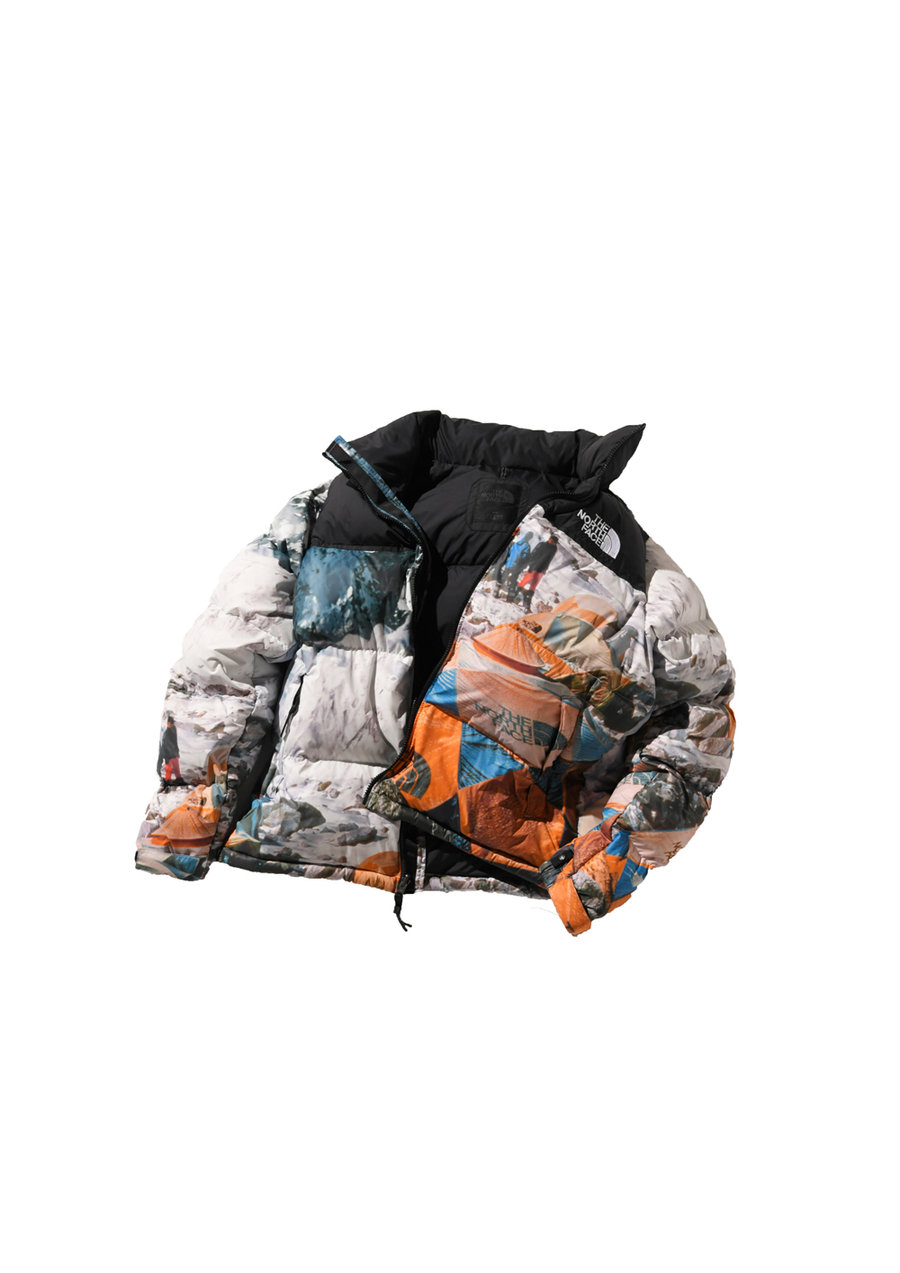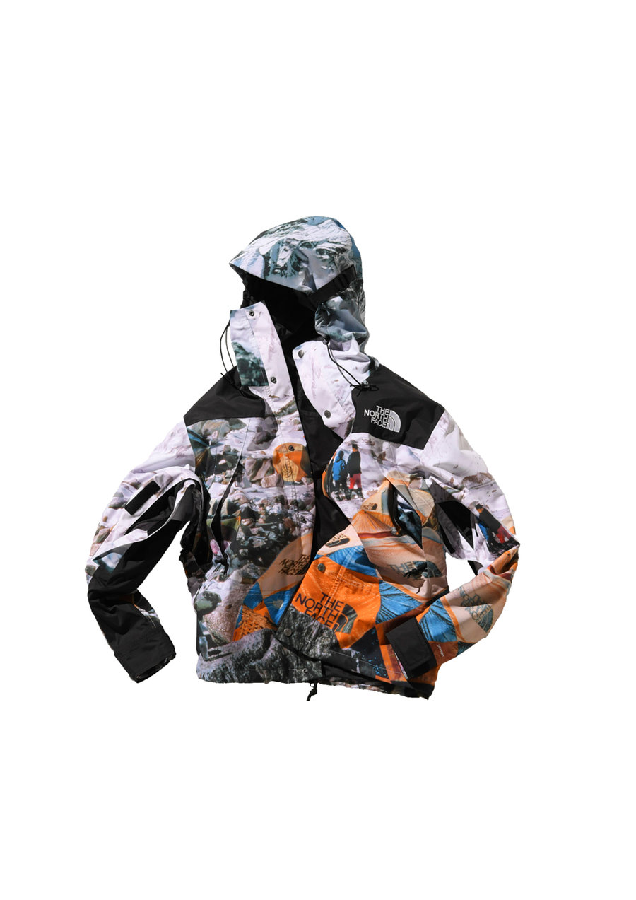 选择的是 Chris Noble 于 1987年在珠穆朗玛峰基地营所拍摄的一张经典照片,带来别样的雪山景观,设计不输 Supreme 联名。