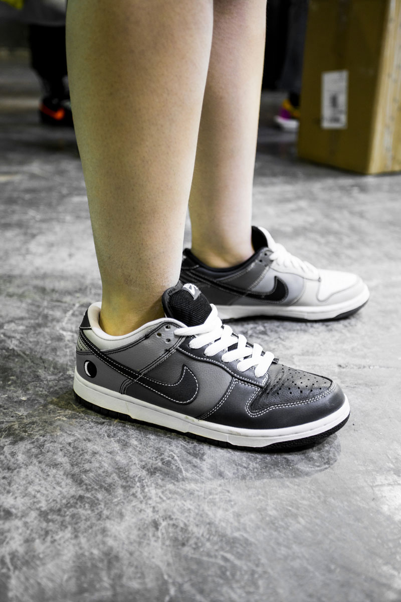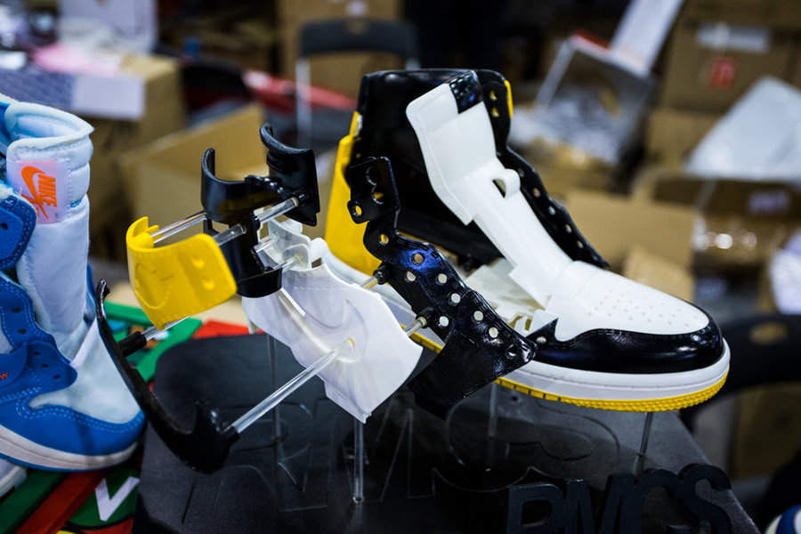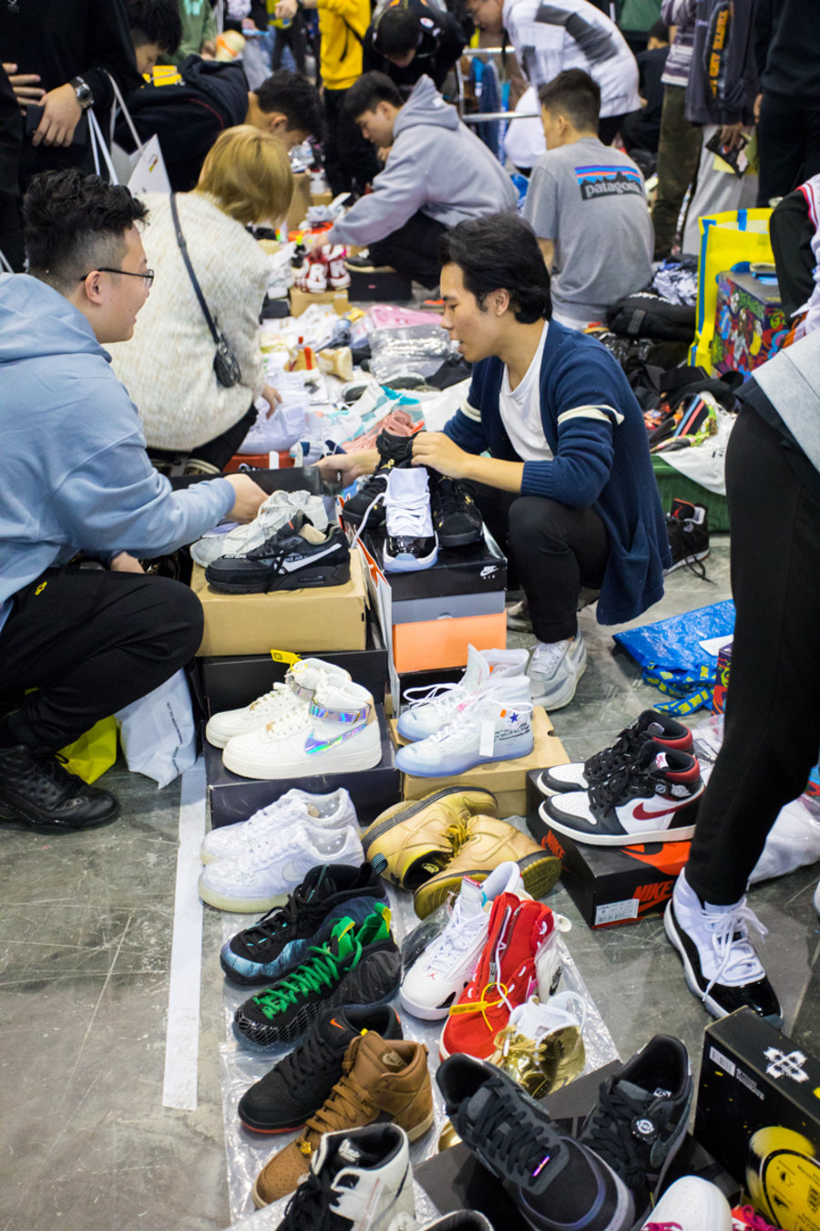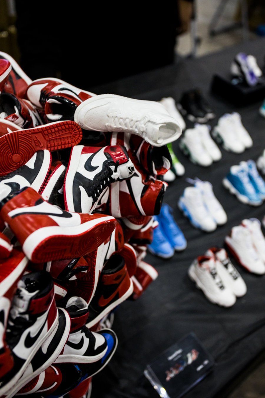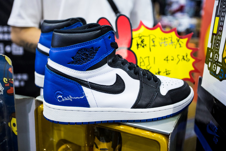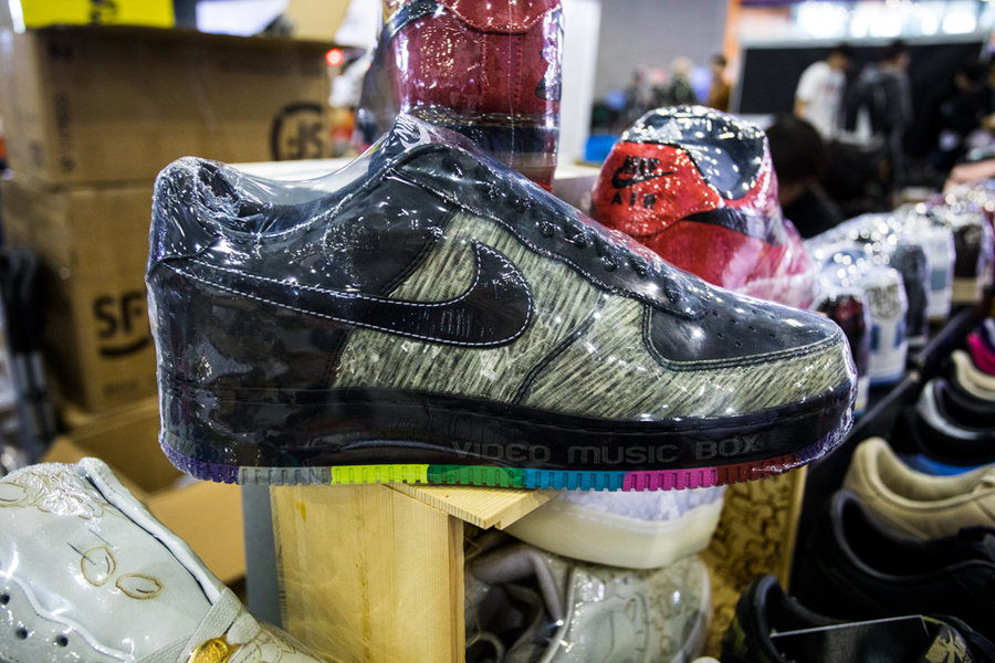 现场一张张桌子上都铺满了球鞋,千奇百怪眼花缭乱,别说倒钩 Air Jordan 1,就是 OFF-WHITE x Nike 的 “The Ten” 在这都不算有排面。