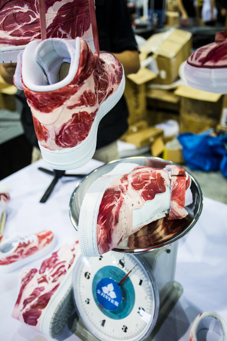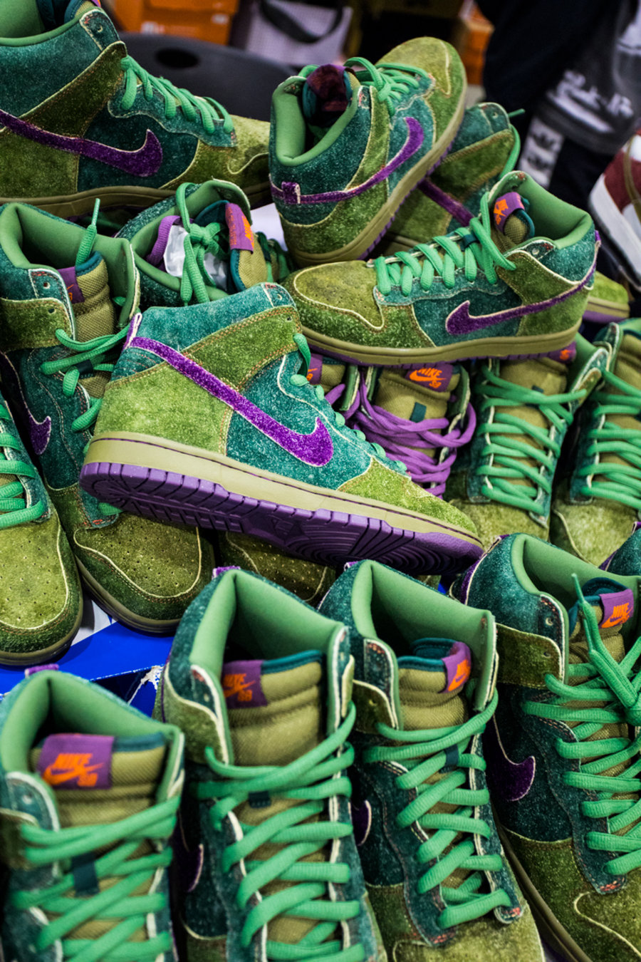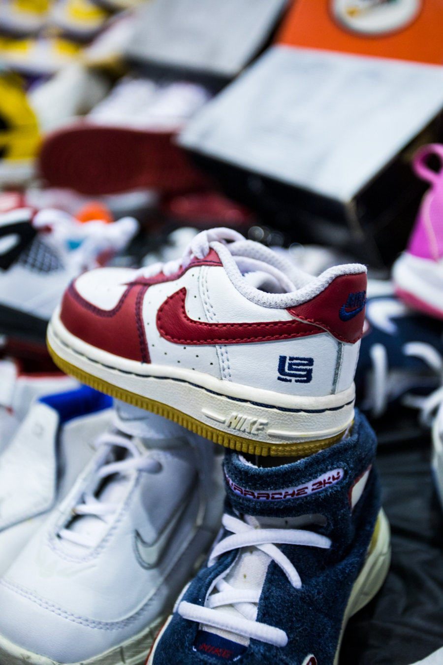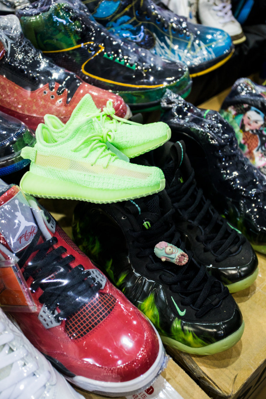 现场一张张桌子上都铺满了球鞋,千奇百怪眼花缭乱,别说倒钩 Air Jordan 1,就是 OFF-WHITE x Nike 的 “The Ten” 在这都不算有排面。