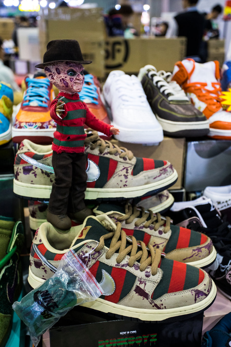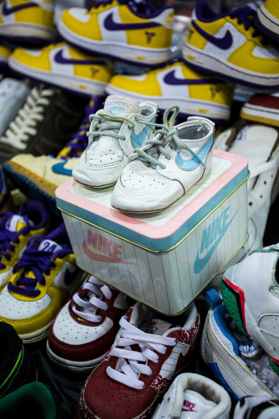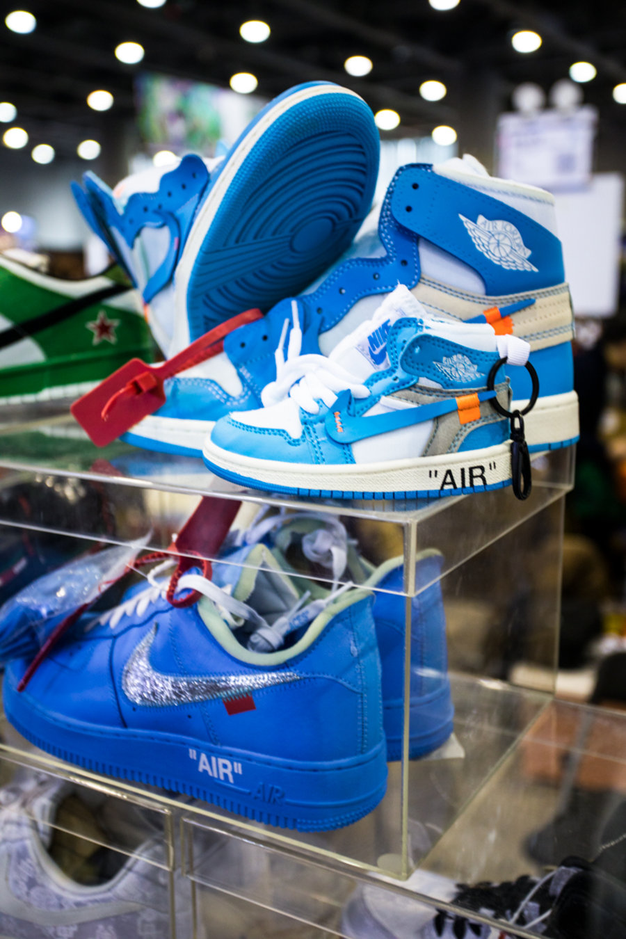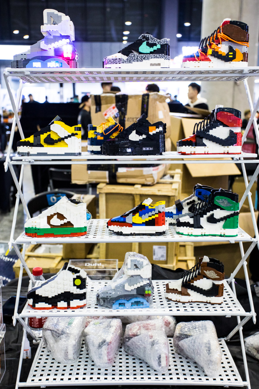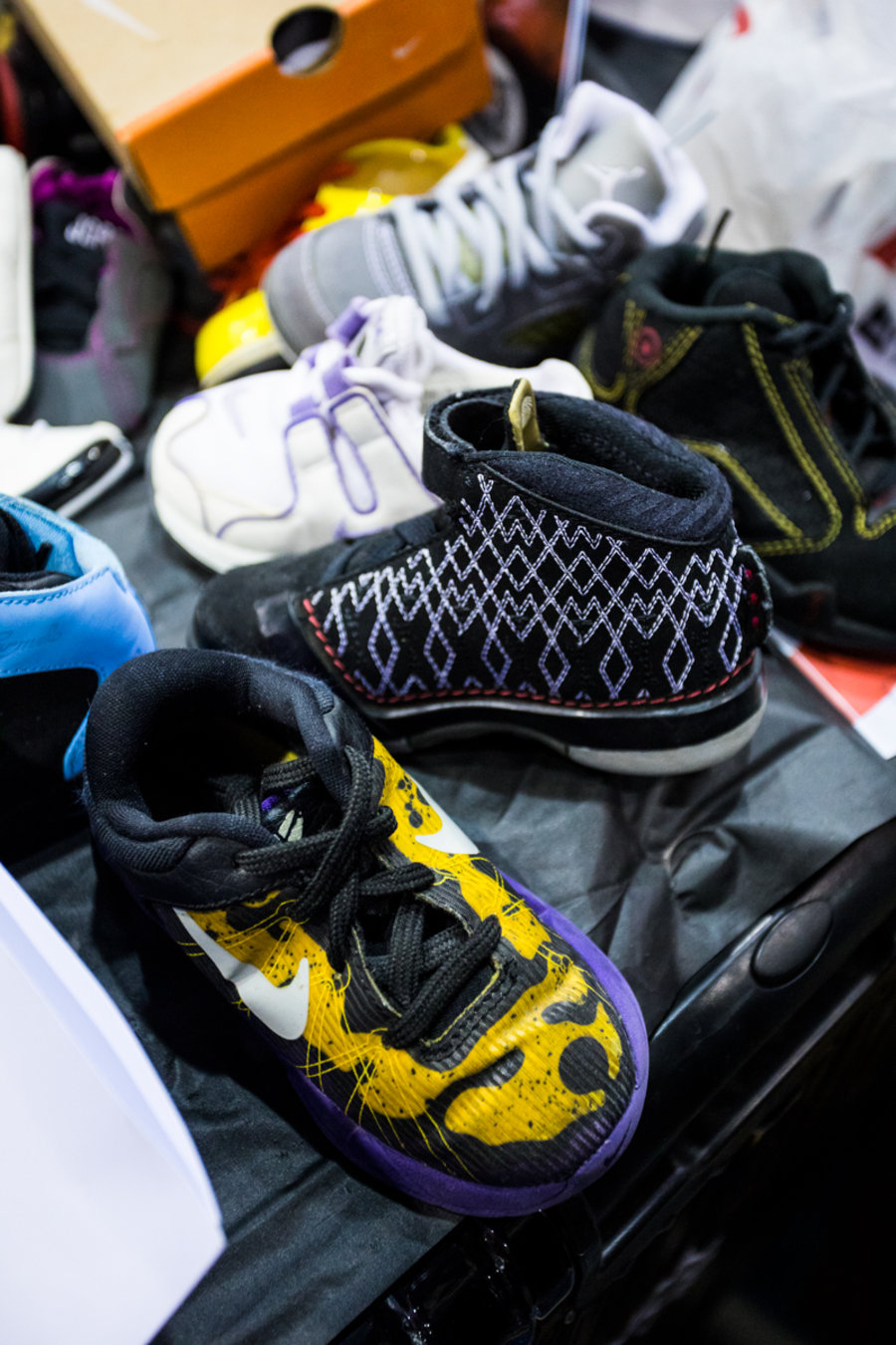 现场一张张桌子上都铺满了球鞋,千奇百怪眼花缭乱,别说倒钩 Air Jordan 1,就是 OFF-WHITE x Nike 的 “The Ten” 在这都不算有排面。