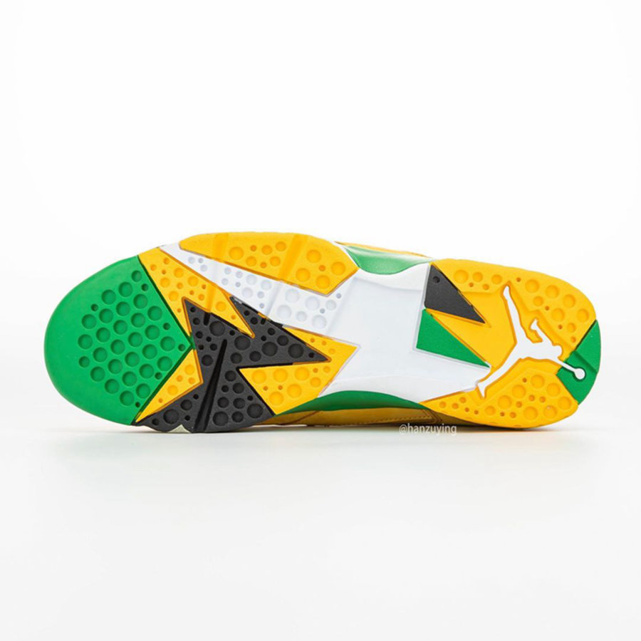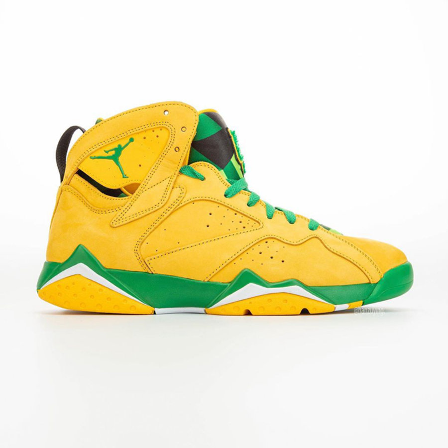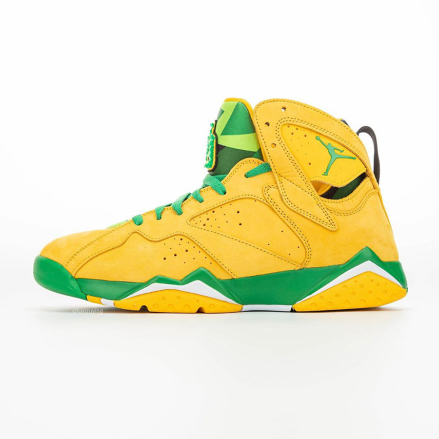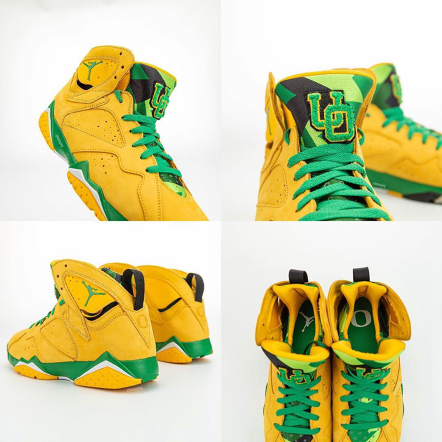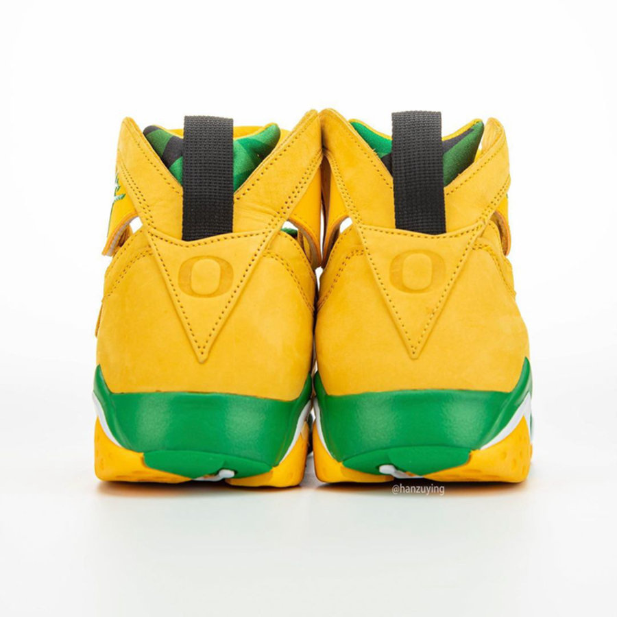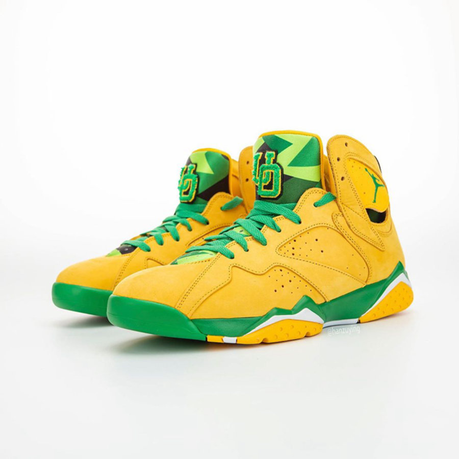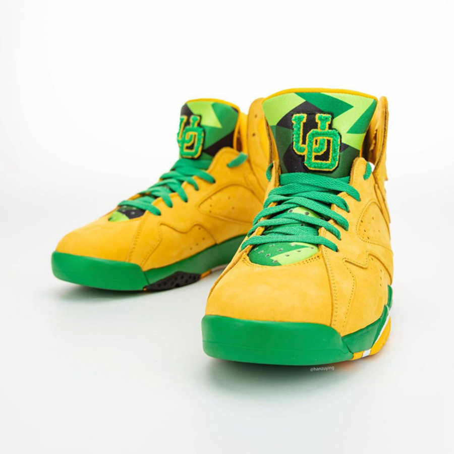 整双鞋以 Air Jordan 7 为设计蓝本,鞋身色彩采用俄勒冈大学标志性黄、绿色调装扮。