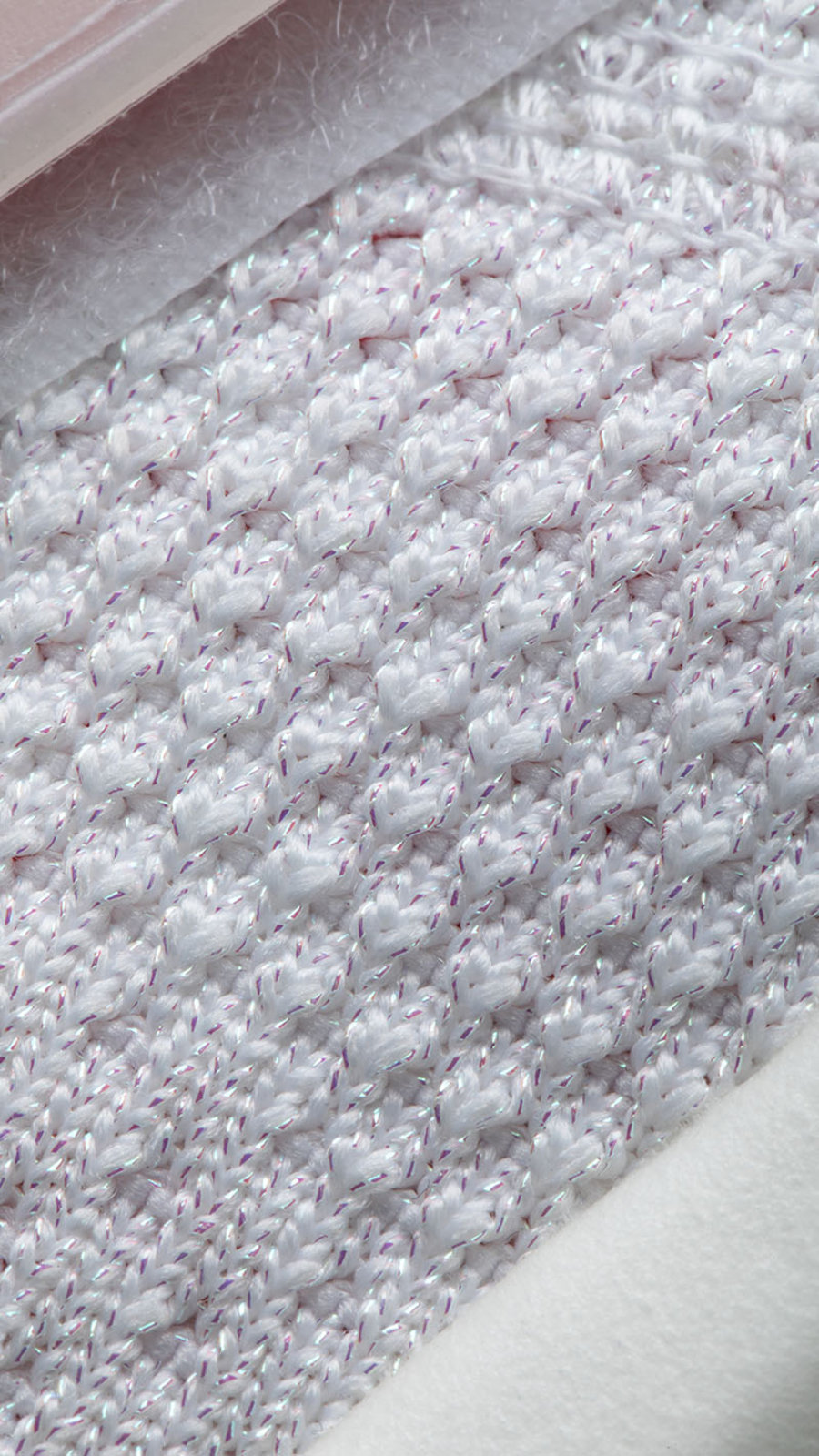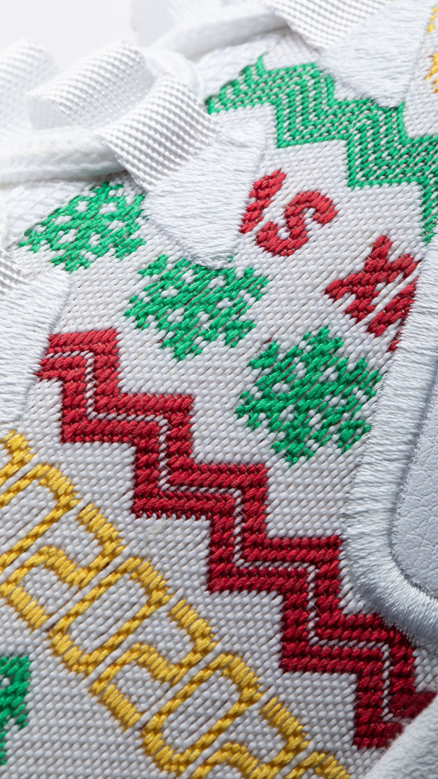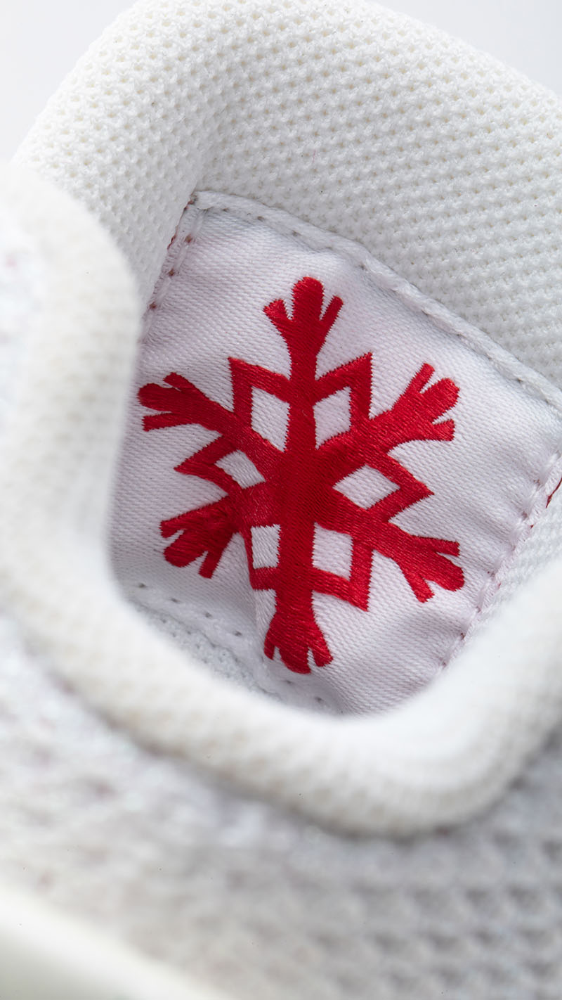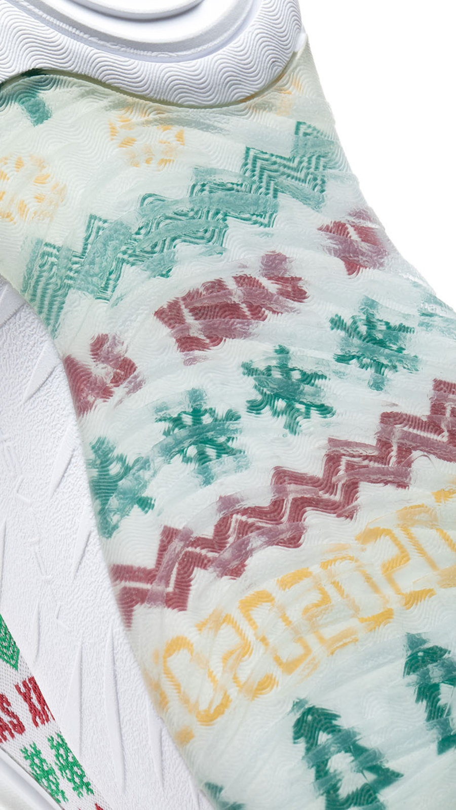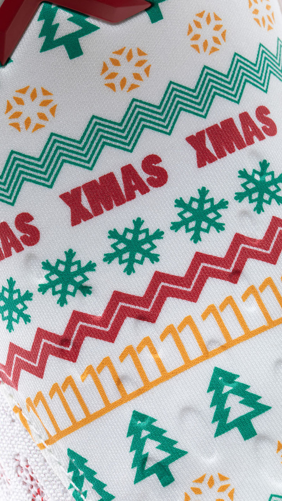 一体编织鞋面以白色为主调,让人过目不忘的的 V 型「面罩」式绑带,采用犹如圣诞毛衣风格的印花覆盖。