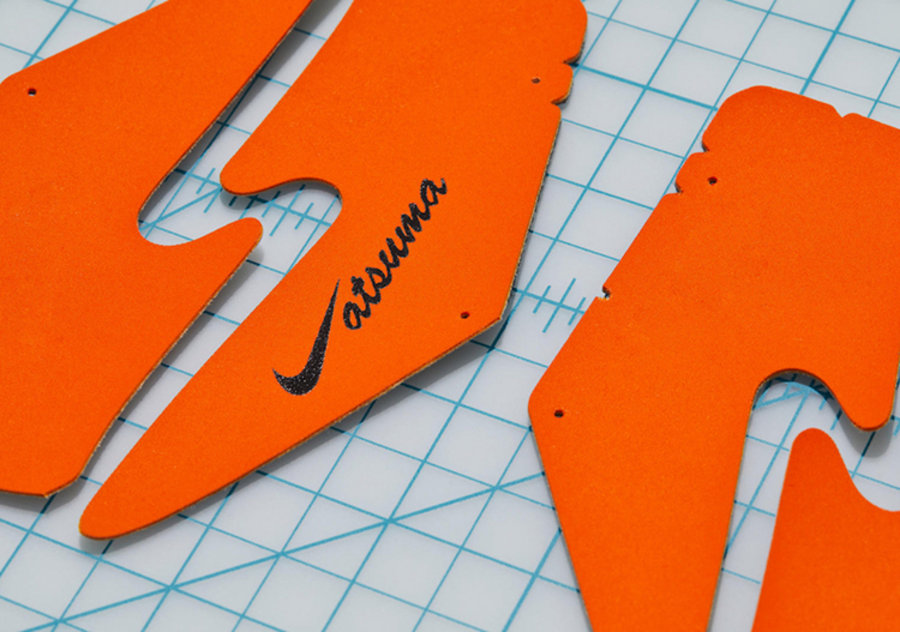 同时鞋带孔位置的特殊挂牌则是又外底余料打造而成,可以说极大程度的减少了浪费。鞋舌与后跟位置还带有 atsuma 字样,彰显鞋款身份。