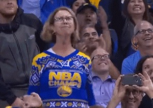 Robin Schreiber 因被赛场摄像机捕捉穿金州同色毛衣跳舞助威而被大家熟知,并以此获得 Dance Cam Mom 的称号!