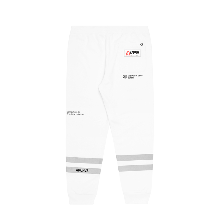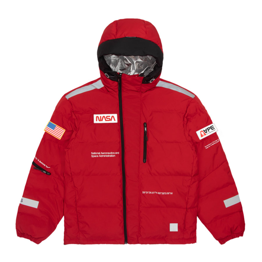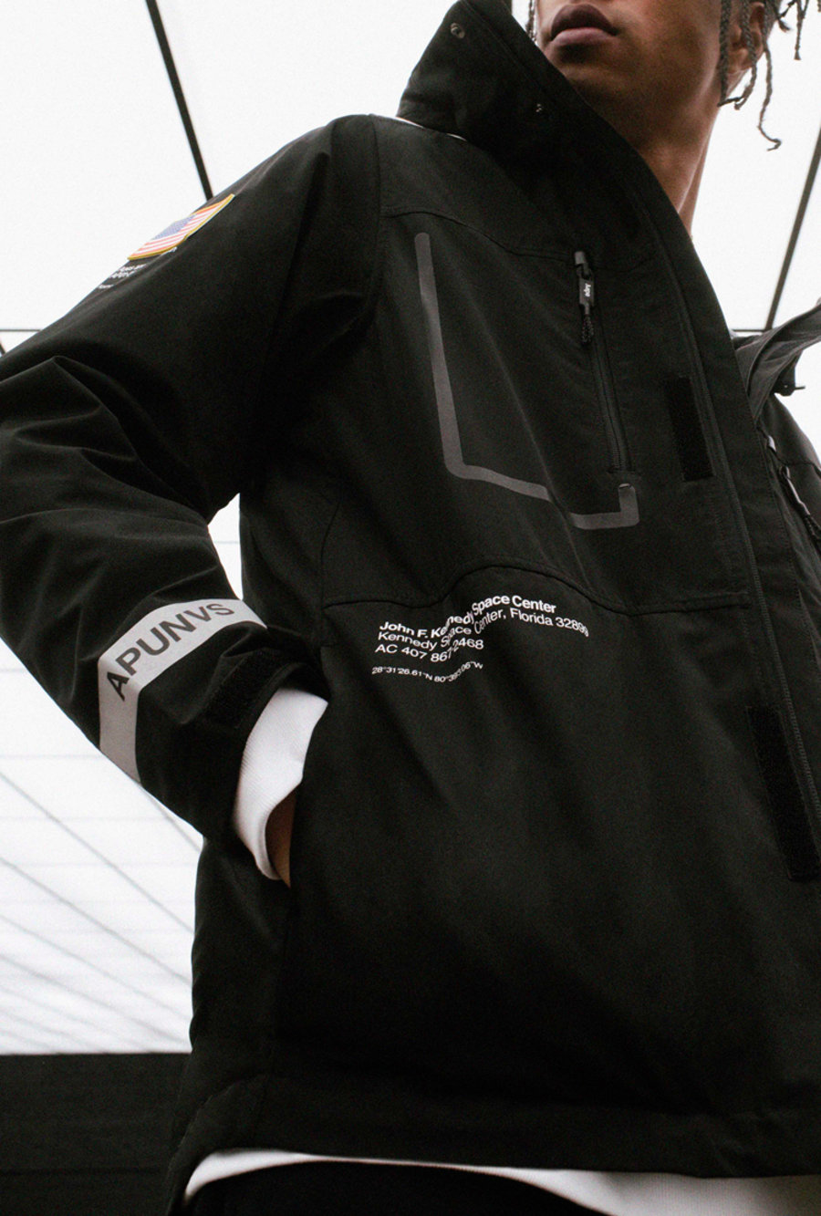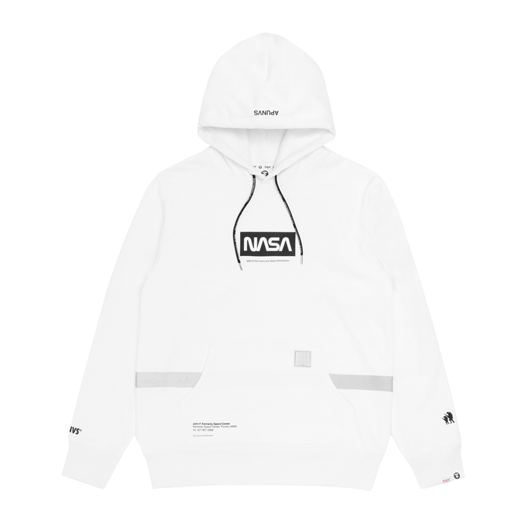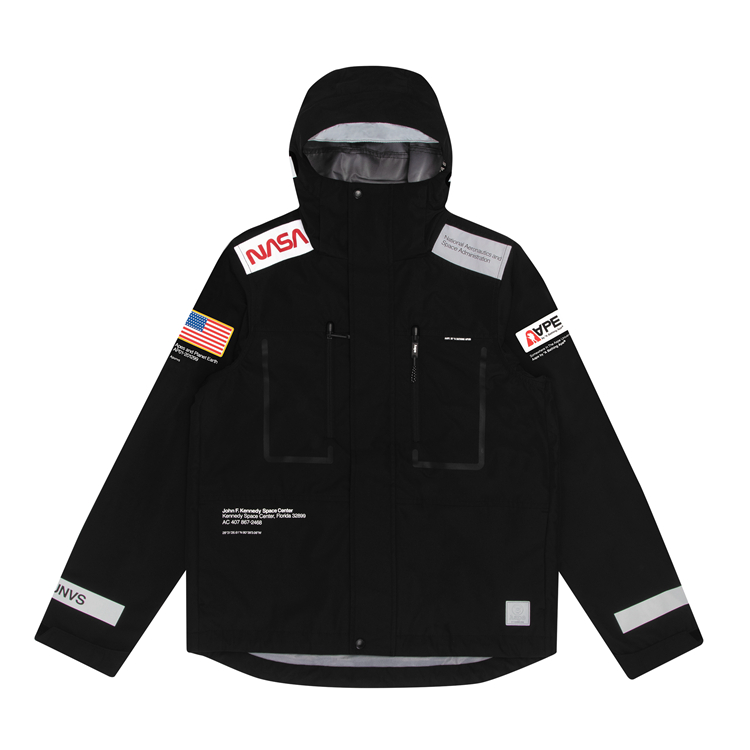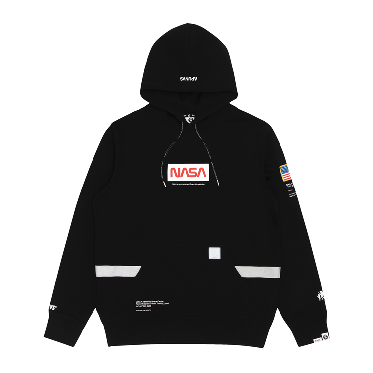 多款服饰中可以看到 AAPE 常用的宇宙标语 APUNVS,以及 NASA 极具代表性的 Worm Logotype 和 Meatball logo 字样,并以 3M 反光材质妆点,能够在弱光环境下反射出耀眼的光芒。