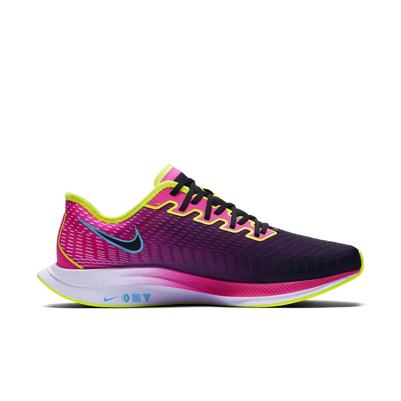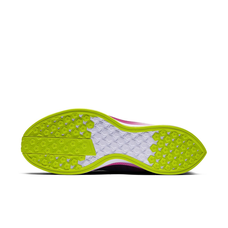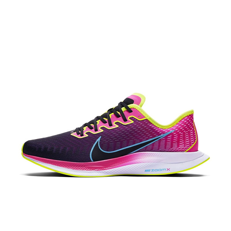 鞋身特别选用紫粉渐变为主调,荧光黄勾勒细部线条!外观延续超大 Swoosh 和空气动力学这些招牌设计,中底缓震为 ZoomX + React 叠加,提供出色的缓震及响应反馈。