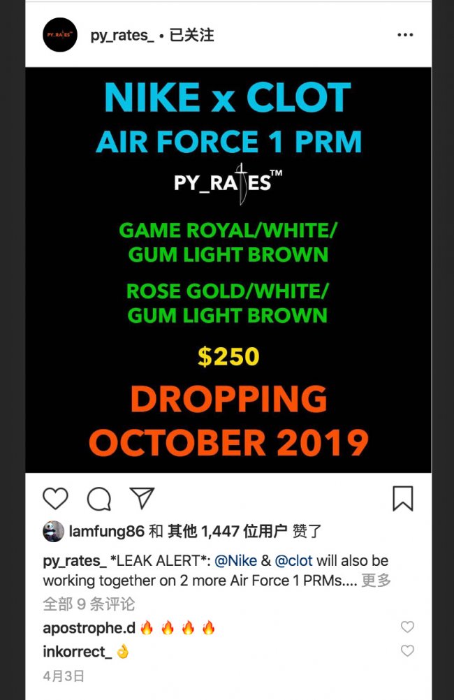 因为商业计划的执行是有时间的,也有一定的「惯性」,这双 CLOT x AF1 采用了同样的规格和设计,应该是之前就已经设计好,并且列入发售计划的。