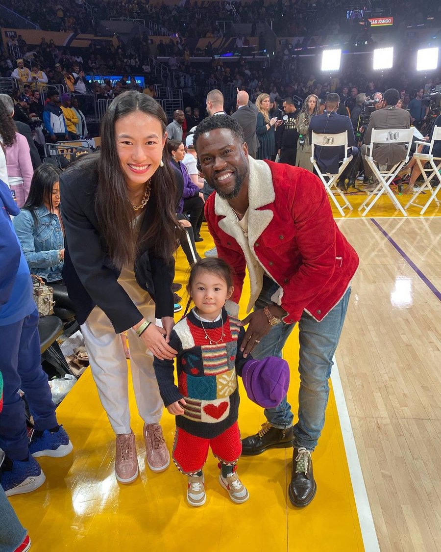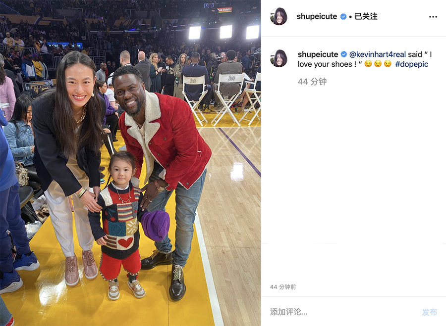 今天冠希全家观看湖人队的圣诞大战,秦舒培晒出与女儿和笑星 Kevin Hart 的合影。