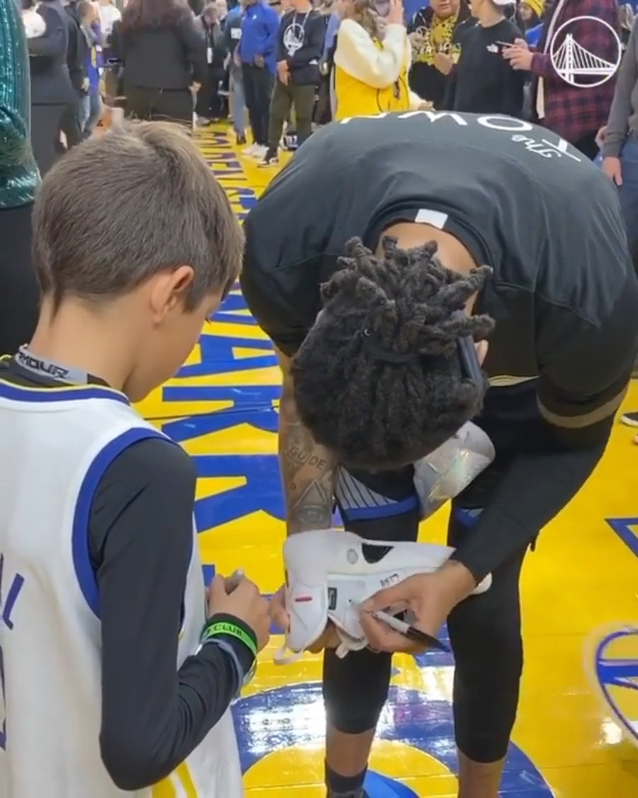 赛后拉塞尔还将这双鞋亲签送给了场边小球迷,这估计是他这个圣诞节收到最好的圣诞礼物了!
