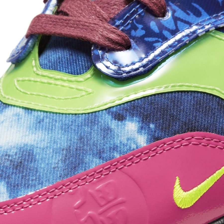 沿袭 Air Max 1 经典造型,鞋身采用粉红漆皮环绕,细节则采用黄、蓝撞色示人!
