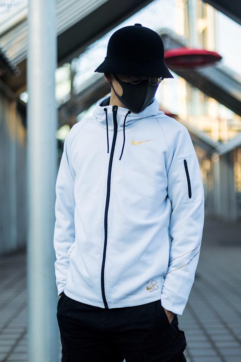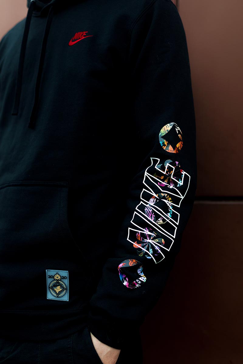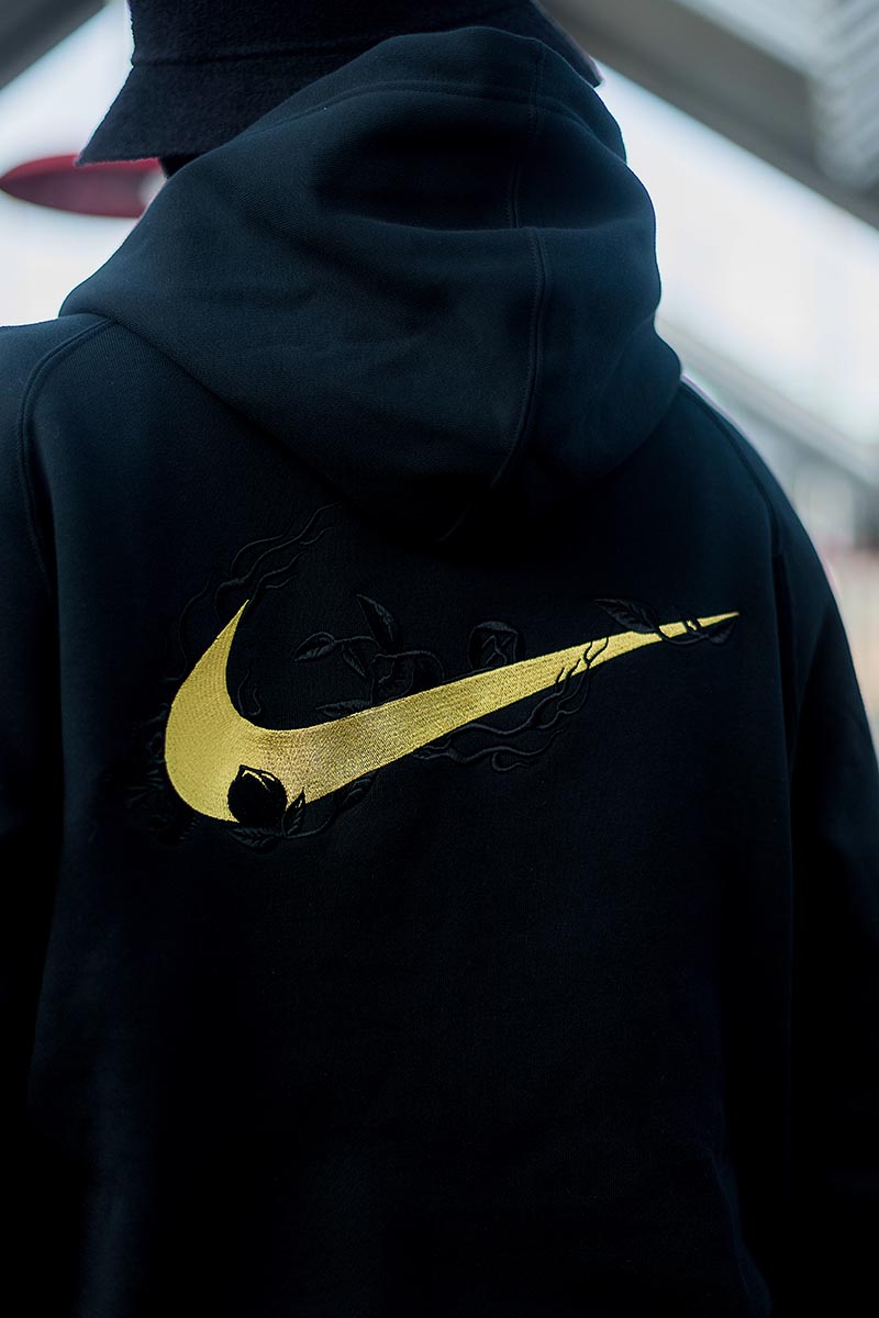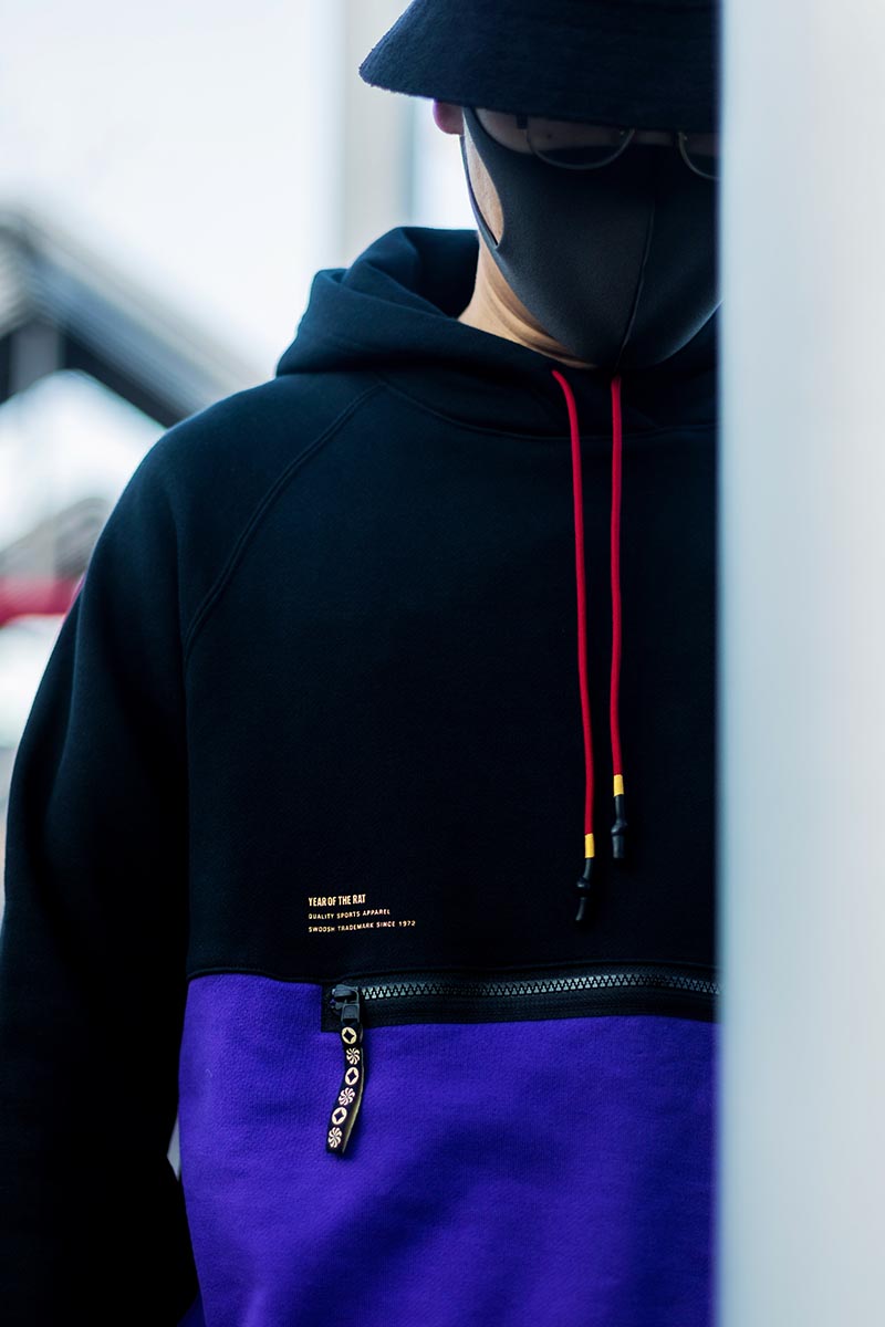 下面这件纯黑帽衫则将剪纸印花放置于手臂外侧,下方侧标则注入 2020 CNY 系列专属 Logo。