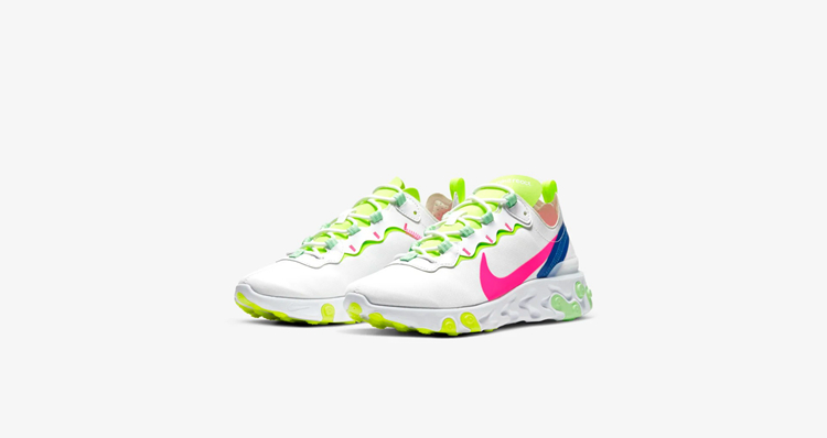 另一款 React Element 55 同样以白色作为底色,鞋身涵盖黄、绿、蓝以及粉色点缀细节,呈现出十足清新的视觉效果,中底搭载 React 缓震科技,能为日常穿着提供出色的脚感。