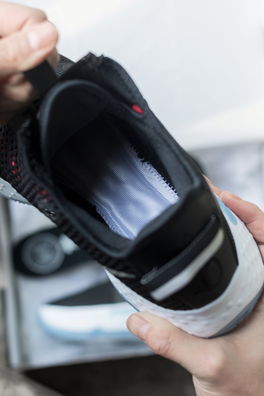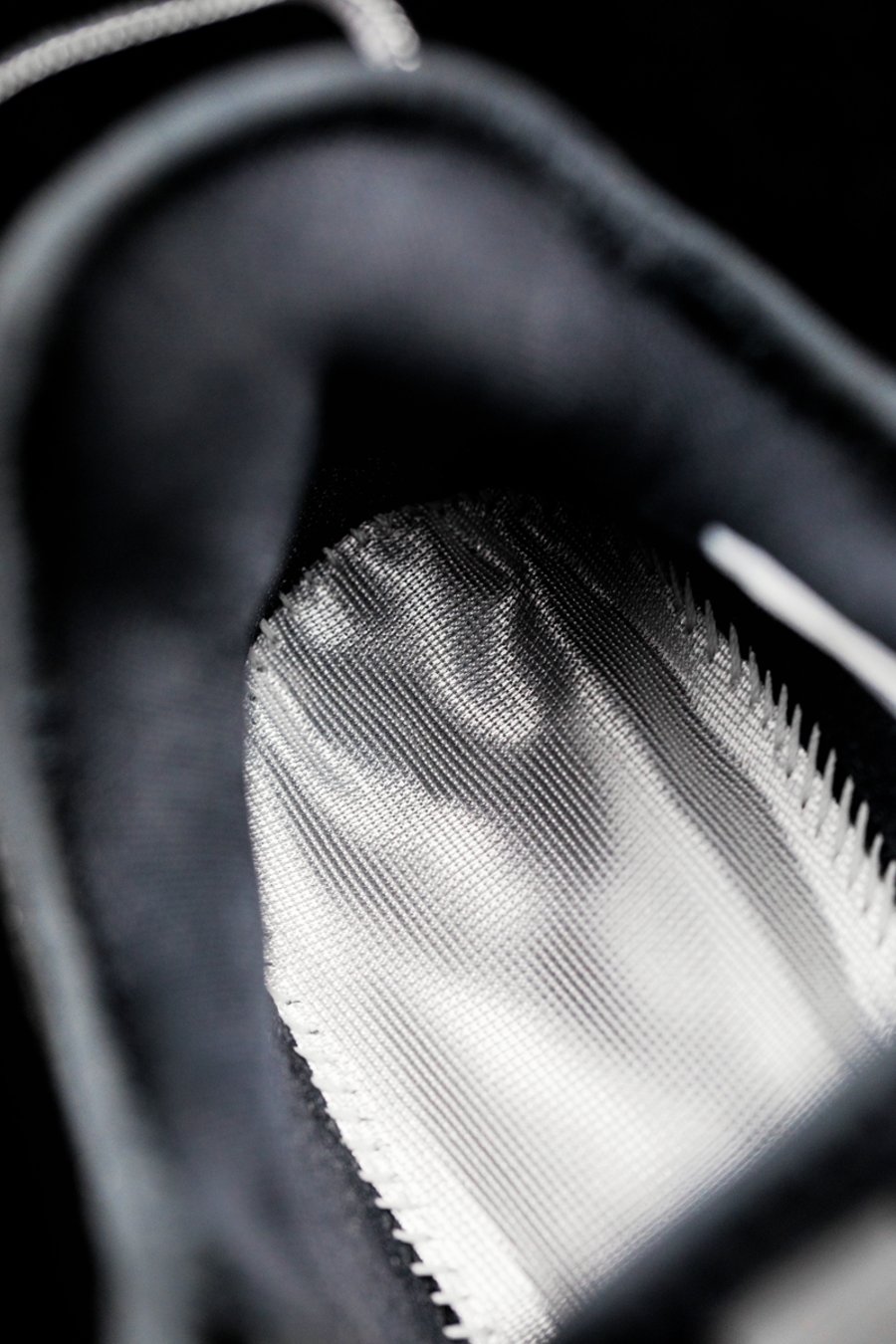 原因在于在最上方的鞋带孔,鞋面预留了向外引出的孔洞。