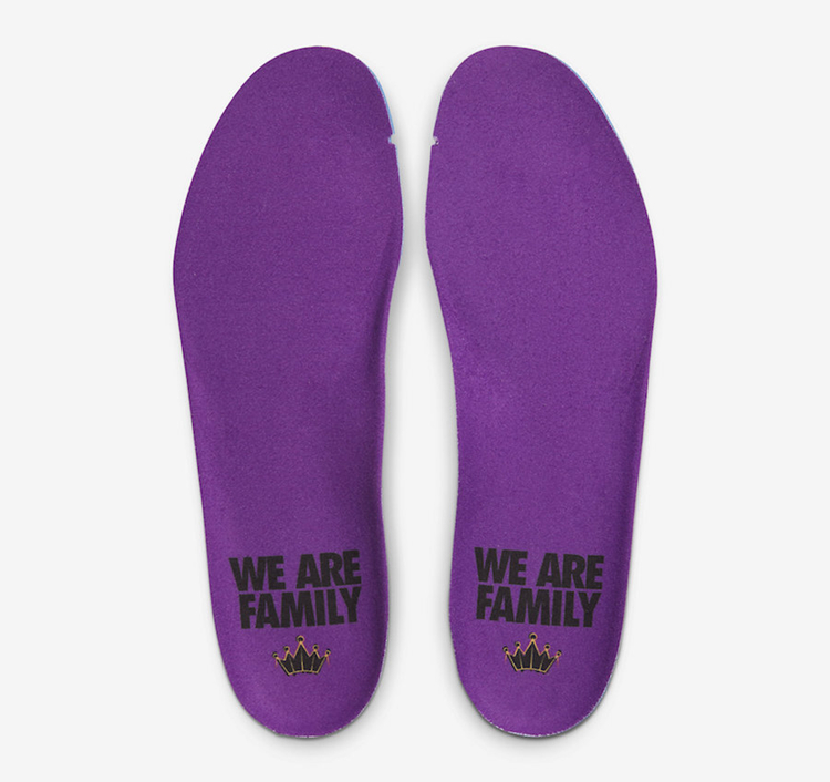 同时鞋带上印有一系列激励人心的话语,彰显詹姆斯一贯的个人形象。鞋垫上也带有王冠 Logo 与 WE ARE FAMILY 字样,呼应配色主题。