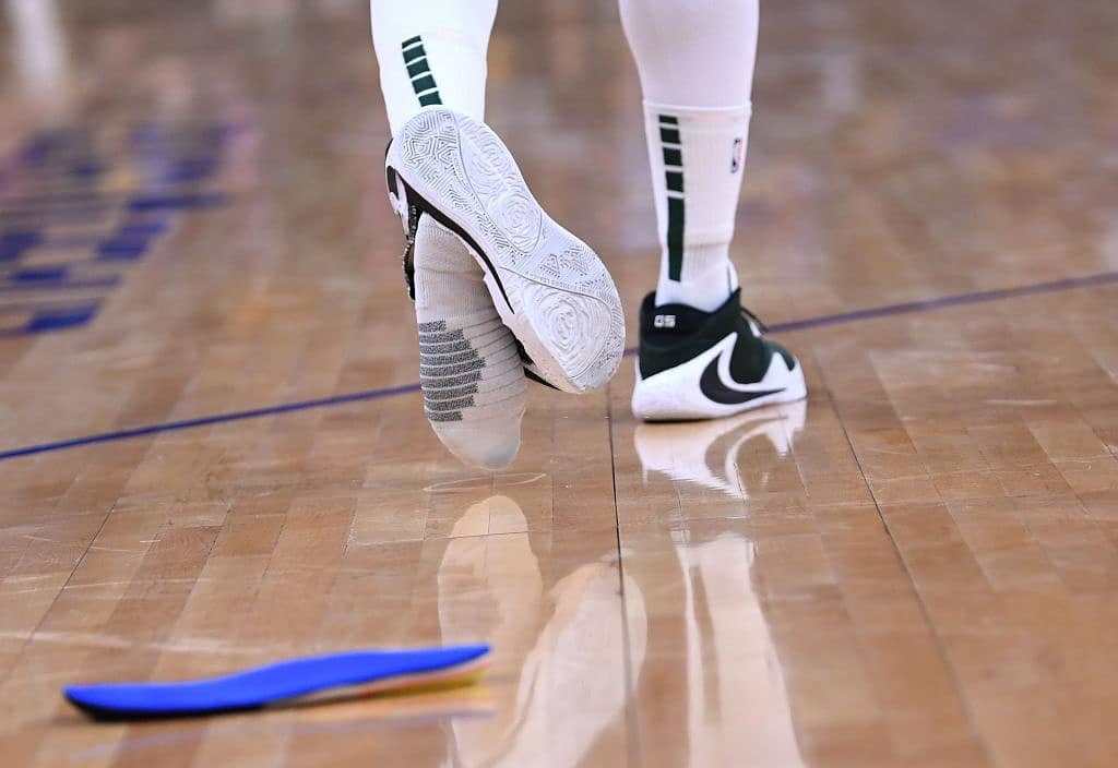 雄鹿球员韦斯利·马修斯在一次防守横移时,直接踩穿了脚上的 Zoom Freak 1,导致勇士一度行成 5 打 4 的尴尬局面。